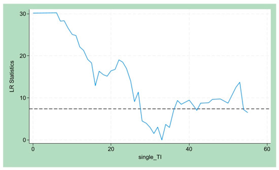 To accurately analyze the threshold effect of the quantity of energy technology innovation in the mechanism of the impact of energy transition on China’s urban GTFP, the section has drawn an LR test chart for energy technology (Figure 3). By observation, it can be noted that when the number of energy policies is in the range of [29.5, 34], the LR statistic remains below the critical value of 7.35, indicating a significant single threshold effect of energy technology in the analysis of the impact of energy transition on GTFP in Chinese cities.