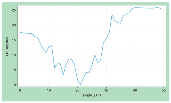 From the results in Table 10, it can be seen that for the threshold test with the quantity of energy technology innovation as the threshold variable, the F-value of a single threshold value is 45.56, which passed the 1% level significance test. While both the dual and triple thresholds did not pass the significance test. According to the test results, it is obvious that in the model of the impact of energy transition on GTFP in Chinese cities, there is only a single threshold effect in the number of energy policies. Thus, the subsequent threshold regression estimation results are also only estimated using the single threshold model of energy policy reform. Meanwhile, as shown in the table, the threshold for the number of energy policies is 21, with a 95% confidence interval of [19.5, 22].