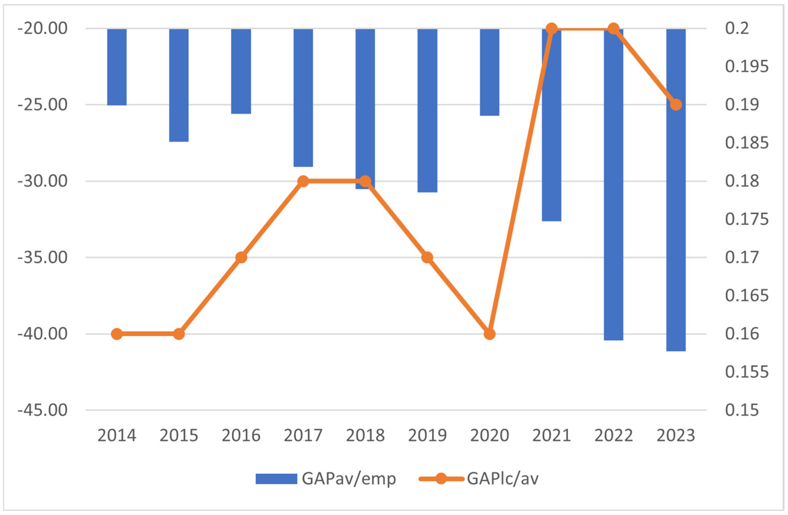 Figure 2. Differences between cooperatives and capitalist firms in the AV/EMP ratio, GAPav/emp = AV/EMPCOOP − AV/EMPcap and in the LC/AV ratio, GAPlc/av = LC/AVCOOP − LC/AVcap.