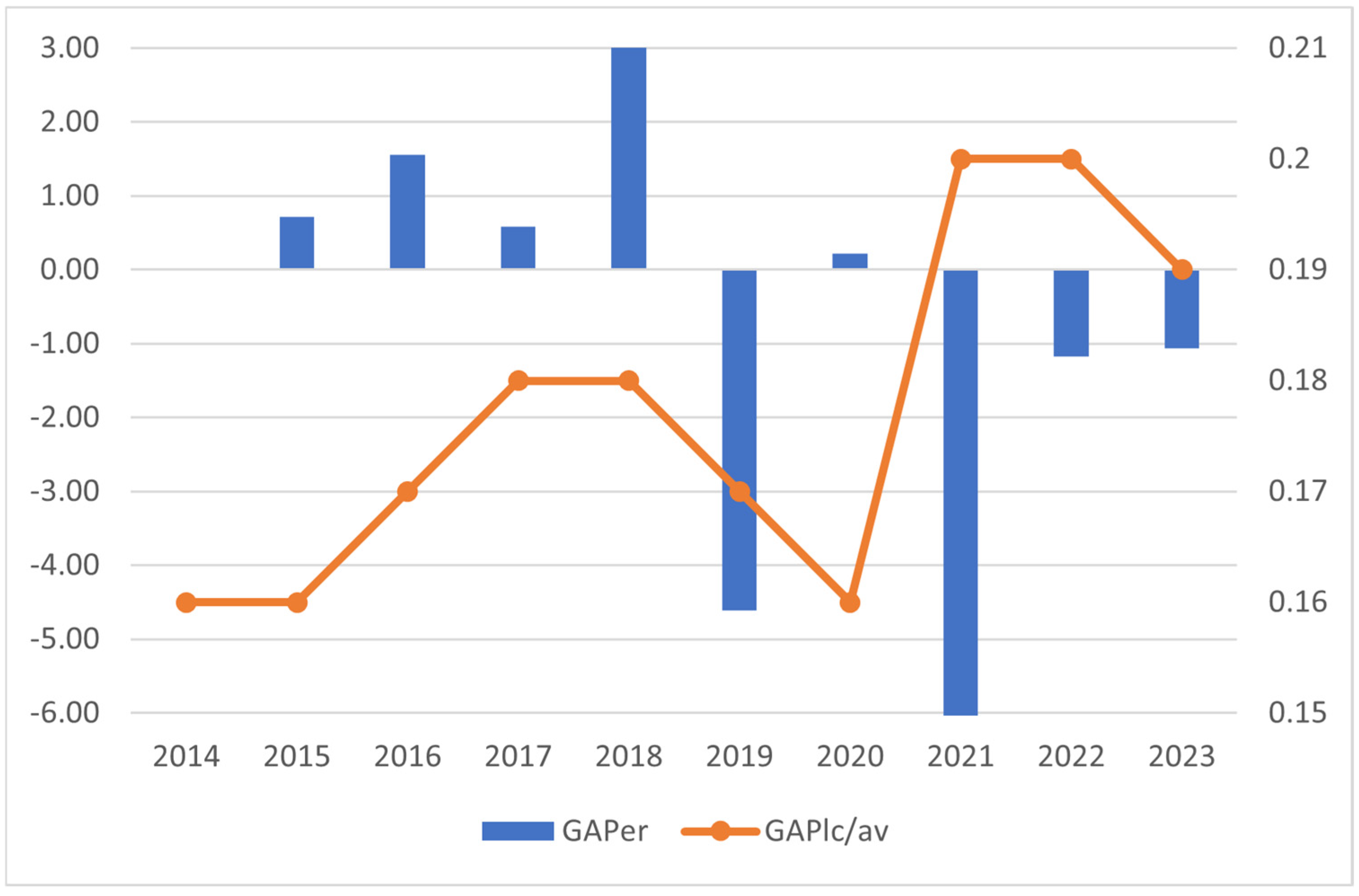 A possible summary of the data and results discussed in this section is presented in Figure 3, which shows the difference between the LC/AV ratio of cooperatives and that of capitalist firms, GAPlc/av = LC/AVCOOP − LC/AVcap, as well as the difference in employment resilience indicators, GAPer = ERCOOP − ERcap.