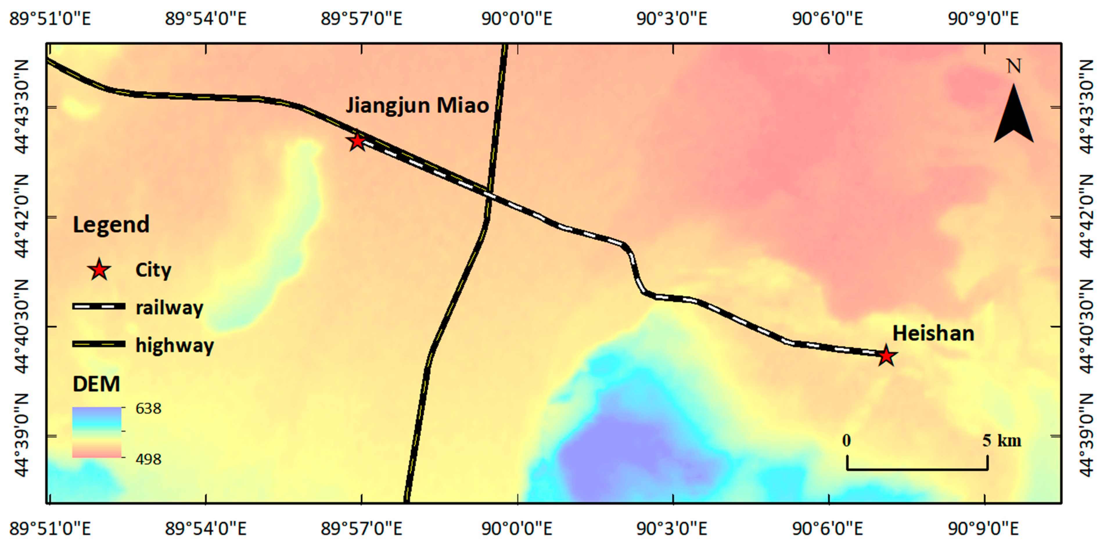 Figure 2. Due to the railway line passing through uninhabited areas during the snowfall period, there is a lack of historical meteorological observation data. Currently, the study of wind-induced sand and snow compound disasters on the railway line remains in the preliminary judgment stage. However, the formation of these compound disasters has already severely impacted the normal operation of trains. Therefore, the prevention and control of wind-induced sand and snow compound disasters are urgently needed.