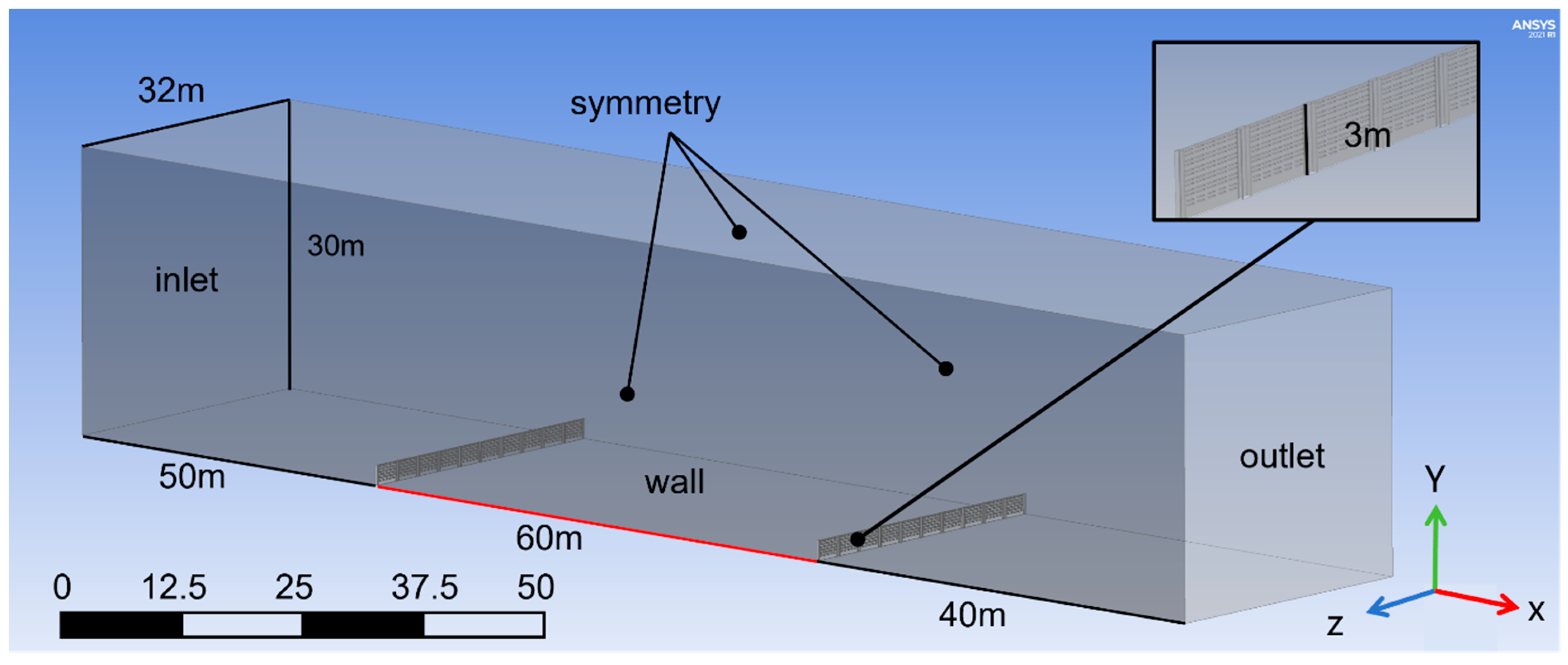 18], where they serve as powerful tools to reveal complex fluid–solid coupling and optimize protective structures. These studies demonstrate that numerical simulation provides a universal theoretical and methodological foundation for understanding multiphase flow phenomena, thereby reinforcing its significance in the present research. Building upon these advances, numerous scholars have conducted wind tunnel and numerical experiments to optimize fence structures and improve the prevention and control efficiency of wind–sand disasters. Zhang et al. conducted wind tunnel experiments to study the protective effects of sand fences with different porosities and row arrangements. Their findings indicated that a double-row sand fence with a porosity of 30% demonstrated the best performance in terms of wind resistance and sand-blocking efficiency [