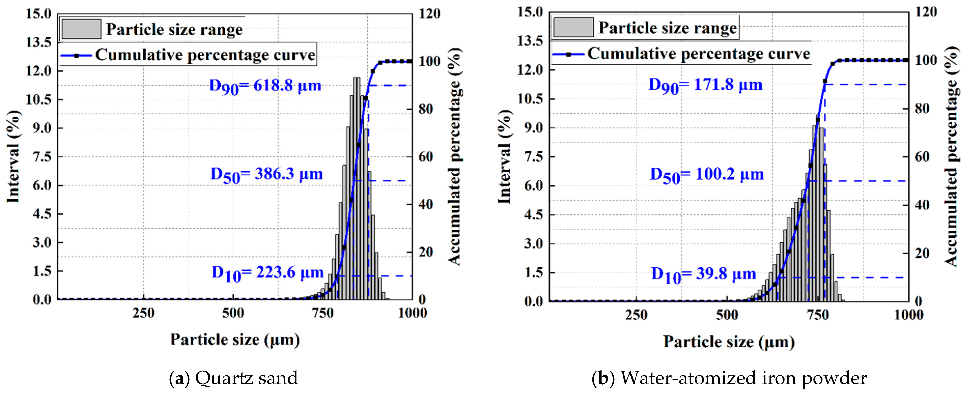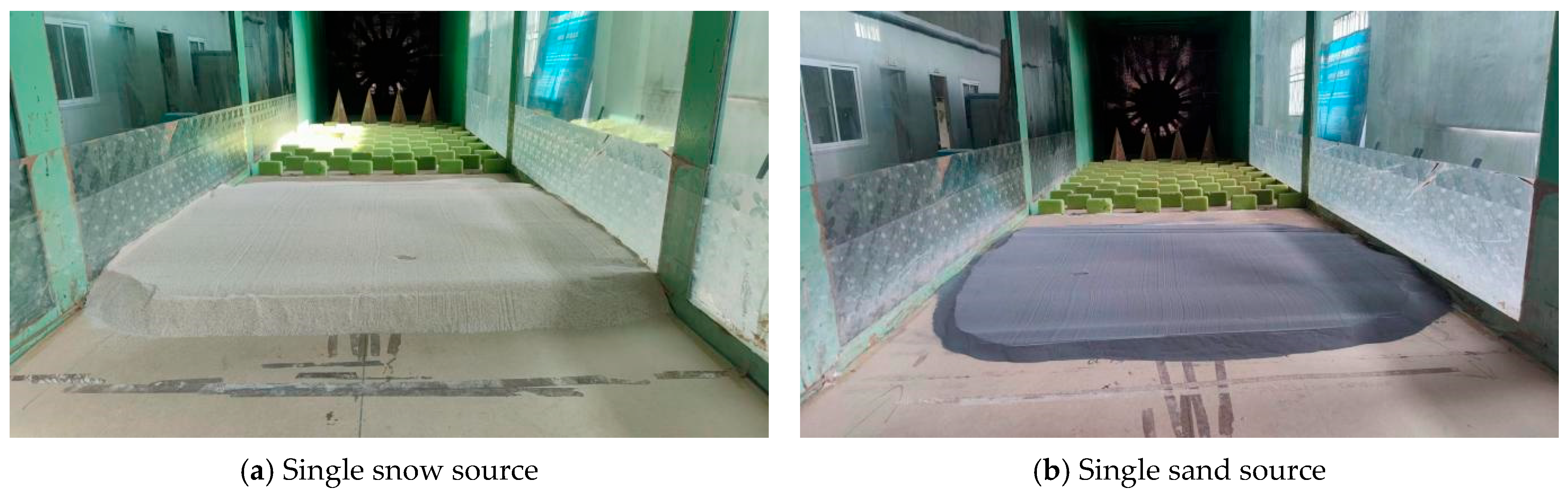 (1) This study uses water-atomized iron powder and quartz sand to replace sand and snow particles, respectively, in wind tunnel tests. Test results indicated that water-atomized iron powder can effectively replace sand particles, and that quartz sand can serve as a suitable substitute for snow particles. It is possible to accurately simulate the migration and deposition process of sand and snow particles by simulating wind–sand and wind–snow compound disasters. Similarly to sand particles, water-atomized iron powder can show the same particle transport characteristics in the simulation of wind–sand flows. Quartz sand, on the other hand, is similar to snow in particle size and can well represent the particle motion laws of snow drifts. This substitution method provided a reliable experimental means for similar future research on wind–sand and wind–snow compound disasters.