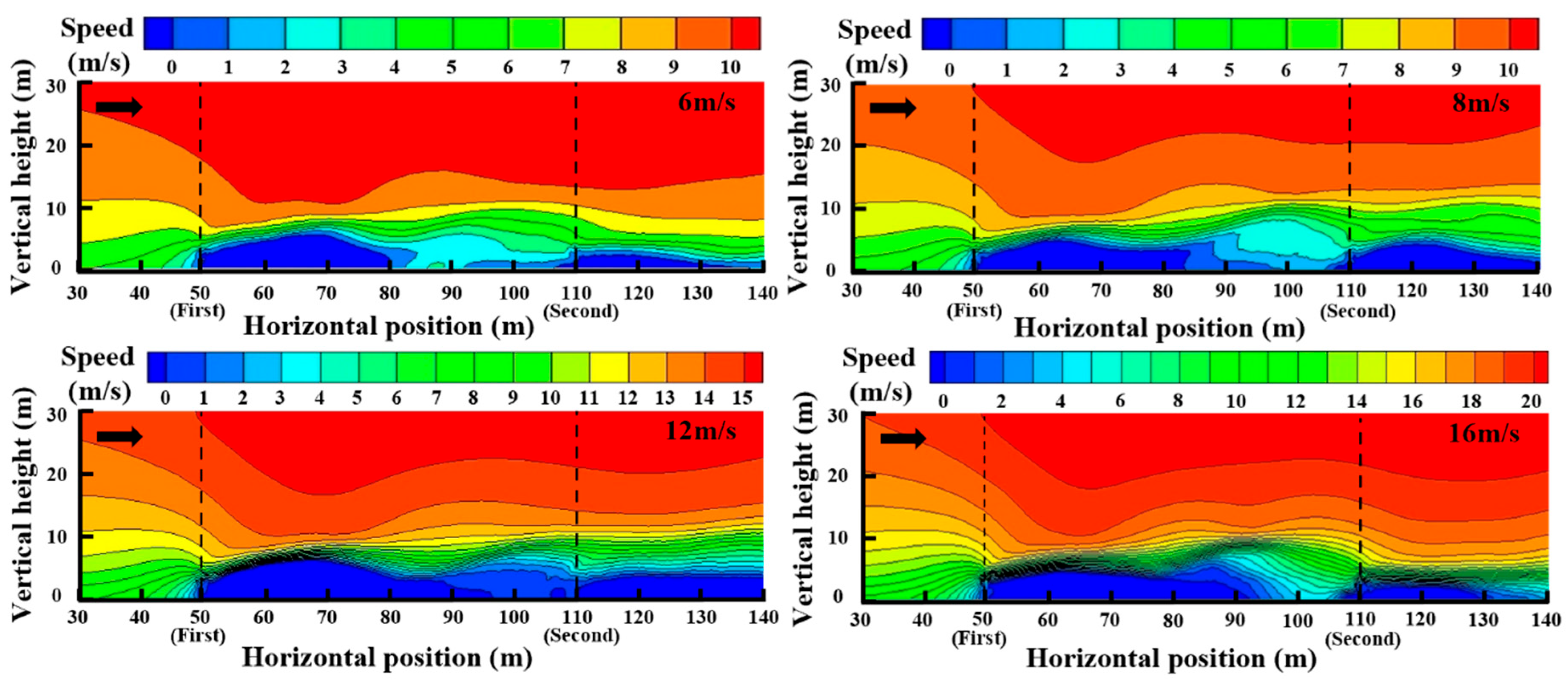 (2) This study discusses the application effect of double-row fences in preventing and controlling wind–sand and wind–snow compound disasters by combining wind tunnel tests and numerical simulation. It reveals that under different wind speeds, double-row fences have a significant inhibitory effect on the wind flow field and can effectively inhibit the transport of mixed sand and snow particles. Moreover, compared with single-row sand barriers, they have a longer protective range.