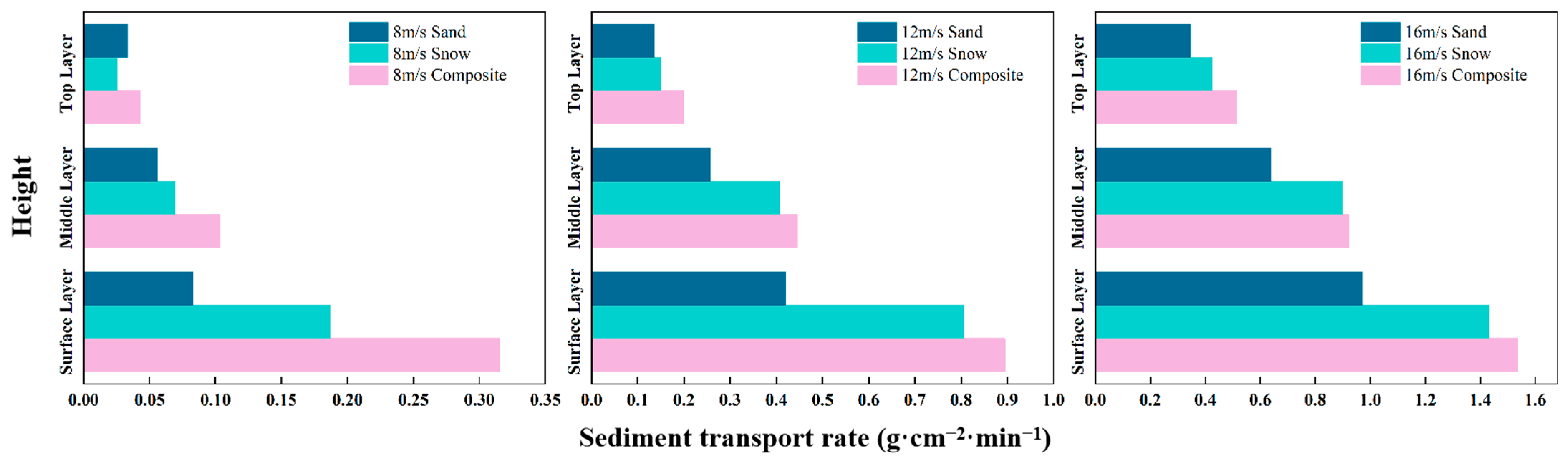 (4) Wind tunnel tests are conducted to explore the particle transport capacity and motion laws of mixed sand and snow particles. The mass of particles decreases with increasing height under each of the three layouts, but the composite source exhibits a stronger particle transport capacity than either the single snow source or the single sand source. In particular, at high wind speeds, the interaction between the deposition of snow particles and the migration of sand particles produces a synergistic enhancement effect, making the transport of particles more complex. This finding highlights the distinct nature of wind–sand and wind–snow compound disasters, which can pose significant challenges to single prevention and control measures, particularly in engineering practice.