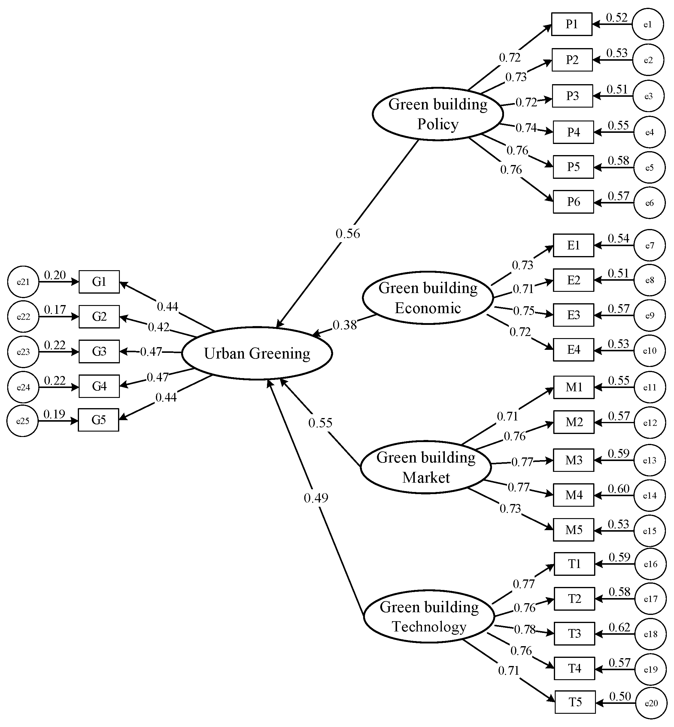Among the four dimensions, the policy component demonstrates the strongest influence, with approval efficiency, regulatory enforcement, and governmental commitment to sustainability yielding an impact coefficient of 0.76. Within the economic domain, financial performance of green buildings and research investment emerge as key drivers, registering coefficients of 0.75 and 0.73, respectively. Regarding market dynamics, public awareness of environmental protection and integration across the industrial supply chain show the highest influence, each marked at 0.77. For technological aspects, the rate of green technology diffusion and technological maturity exhibit notable importance, with coefficients of 0.78 and 0.77. Future advancement of urban greening through green building development can be strengthened by emphasizing these strategic directions, which closely align with the ESG (Environmental, Social, and Governance) framework. From an environmental perspective, green buildings lower emissions and enhance resource efficiency; from a social standpoint, they improve air quality and create healthier, more livable communities; and from a governance angle, mechanisms such as green certification systems and performance accountability ensure transparency and policy adherence. Collectively, these strategies foster the transition toward low-carbon urban systems by embedding green infrastructure within city cores, reducing reliance on fossil fuels, and expanding carbon-absorbing green spaces. Consequently, the proposed pathways advance both building-level sustainability goals and broader urban ecological objectives.