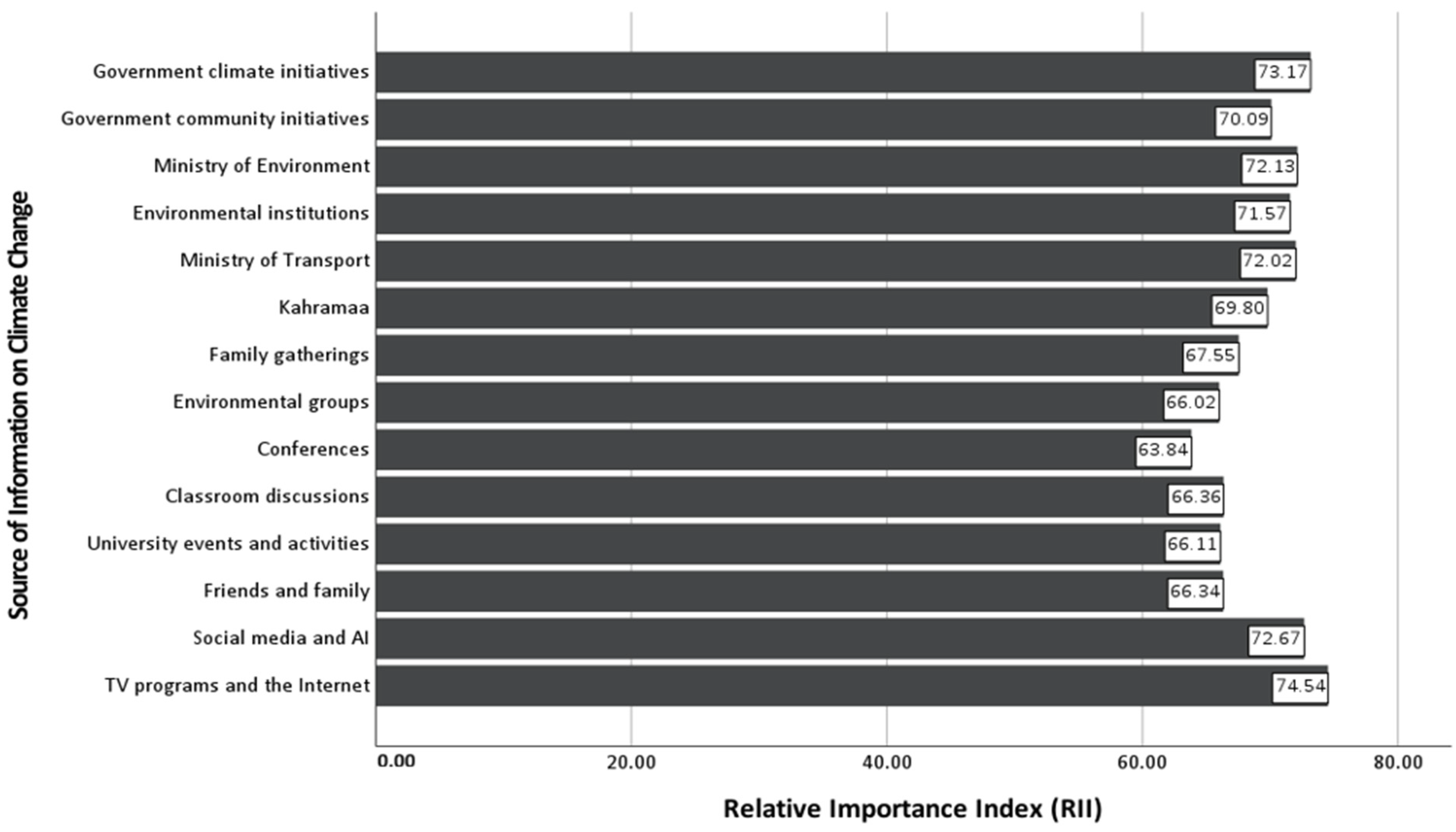This study found high climate awareness among female students in Qatar University, with significant predictors including digital platforms (TV/Internet, social media/AI) and government-led campaigns (e.g., Kahramaa). However, the use of “social media and AI” as a combined item may mask differences in how students engage—whether passively or actively, via AI-curated vs. human content. Future refinements should isolate these elements to better understand their unique influence on climate awareness and behavior. Our sample limitation (female-only, single institution) constrains generalizability, a point we acknowledge explicitly.