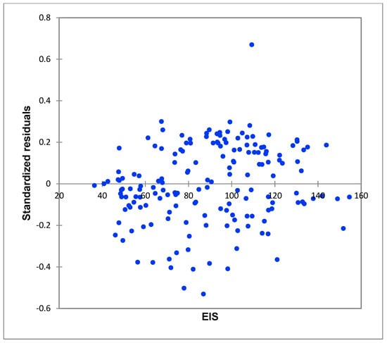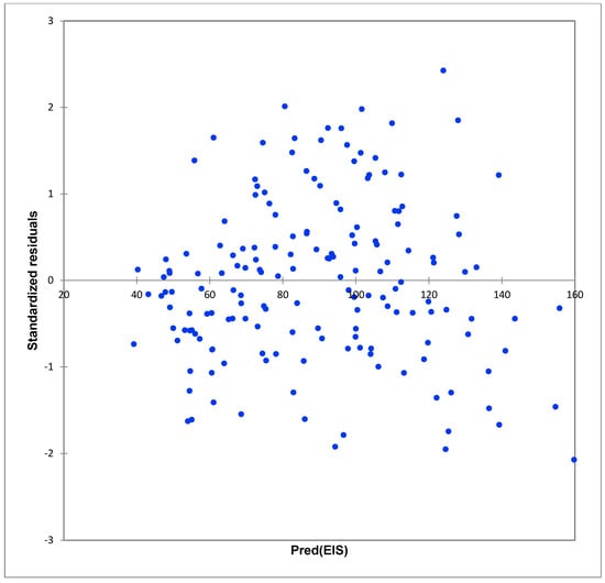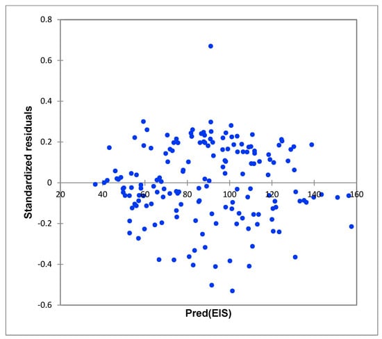 Based on these estimates, the model appears robust. The PCR model functions well in the presence of series that may present multicollinearity and non-heteroscedasticity problems. Figure 9 and Figure 10 demonstrate that the data’s homoscedasticity condition appears to be fulfilled. Homoscedasticity occurs when the residuals are uniformly distributed around the zero line with no obvious pattern.