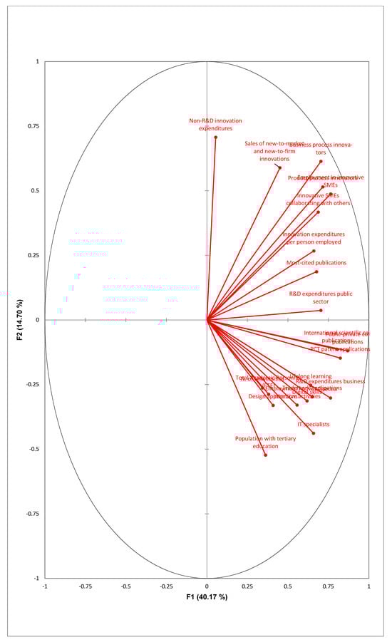 The second factor appears to reflect the private sector’s focus on research and development, as well as the international orientation of scientific activities. Indicators such as “Population with tertiary education”, “Most-cited publications”, and “PCT patent applications” have negative values on this factor, while indicators such as “Non-R&D innovation expenditures”, and “Business process innovators” show positive values. The first factor, on the other hand, encompasses elements that foster innovation and delineates how individual variables contribute to the overall innovation process. It can be seen as a gauge of a region’s overarching ability to generate innovation. The second factor revolves around the degree of public funding allocated to innovation. Increased public funding can help stimulate innovation within businesses, encouraging collaboration and the formulation of novel business approaches. Concurrently, this could potentially have adverse effects on indicators associated with higher education and research, as resources might be diverted elsewhere. The most innovative regions depict positive values of the first factor, whereas the least innovative regions possess negative values. Furthermore, regions with positive values of the second factor show great availability of funding for innovation at the enterprise level but with less attention to other innovation-related variables such as the Higher Education System and Human Capital, while those with negative values show the marginal regions. Taking Mohnen et al.’s [59] definition, it appears from the analysis of these data that Higher Education System and Human Capital, and Research and Development are complementary policies, whereas financial incentive policies for business innovation are imperfect substitutes. The factor loads described in Table 5 are represented graphically in Figure 7.