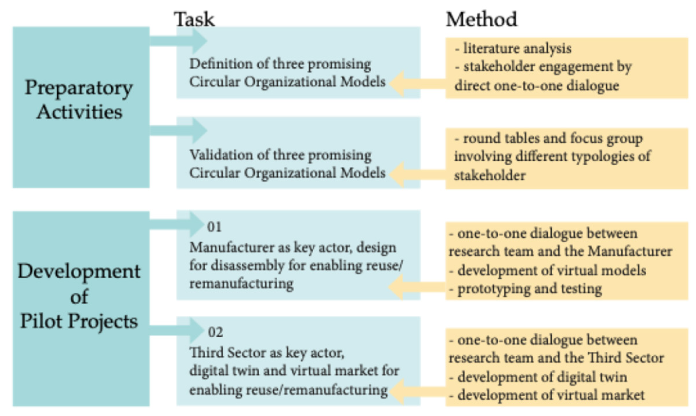 The Pilot Project provides the opportunity of experimental co-creation and knowledge sharing with the involvement of the key actors of the Third Sector. From this experience, some steps can be highlighted in the perspective of a procedure for the application of the Circular Organization Model based on alternative/secondary markets for remanufactured products (OM3) to other categories of products and sectors: