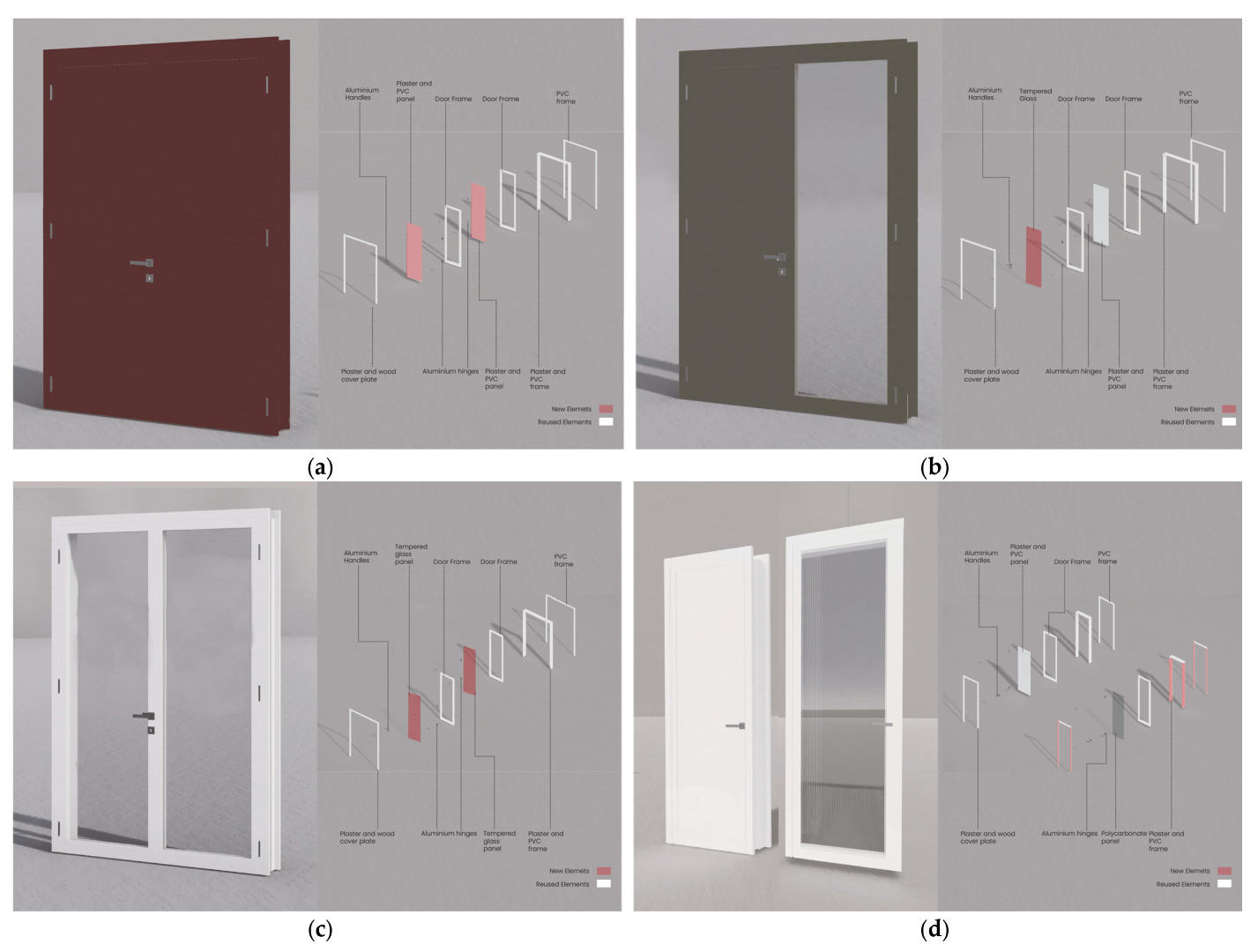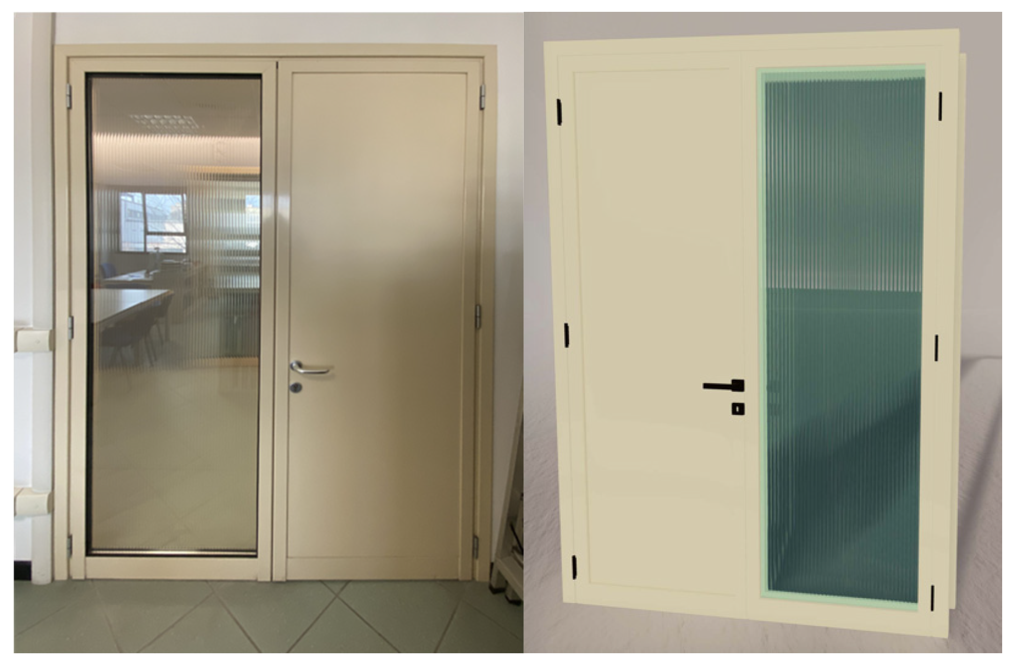 The application area of the experimentation is a set of doors still in excellent condition, deriving from renovation activities in some offices of the Politecnico di Milano, which was originally intended to be sent to landfill. The doors measure 1.58 × 2.23 m and the principal material is PVC. Each door consists of two symmetrical doors; one made of PVC and the other of plexiglass.