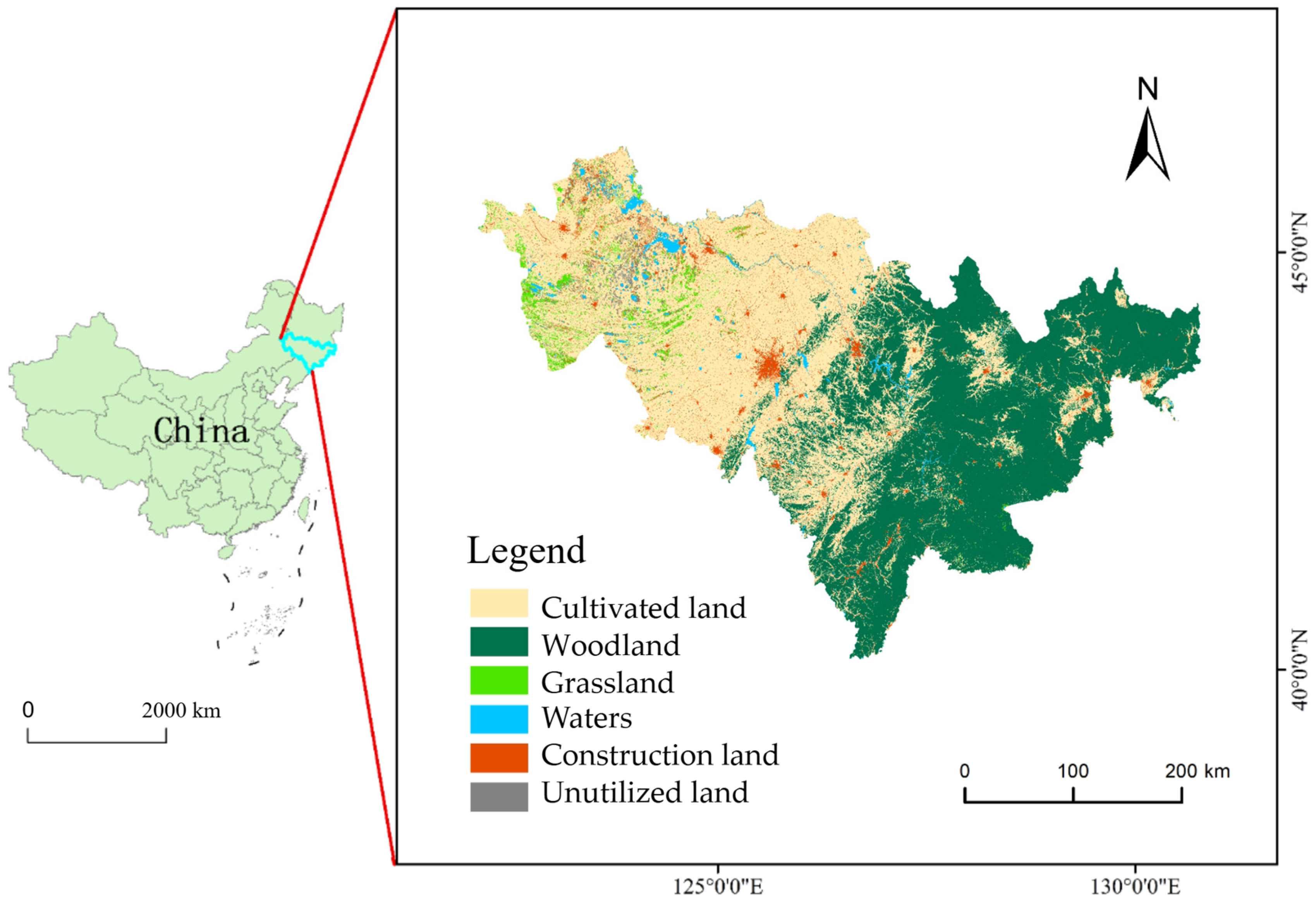- Over the period from 2002 to 2022, Jilin Province exhibited significant stage-specific variations in land use types. The area of water bodies and construction land generally showed an expanding trend, while the area of cultivated land remained relatively stable, consistently accounting for approximately 46% of total land use.