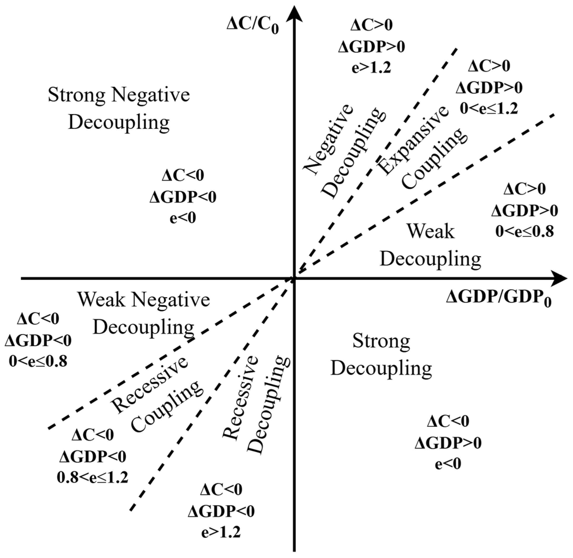 - Shen, T.; Hu, R.; Hu, P.; Tao, Z. Decoupling between economic growth and carbon emissions: Based on four major regions in China. Int. J. Environ. Res. Public Health 2023, 20, 1496. [Google Scholar] [CrossRef] [PubMed]