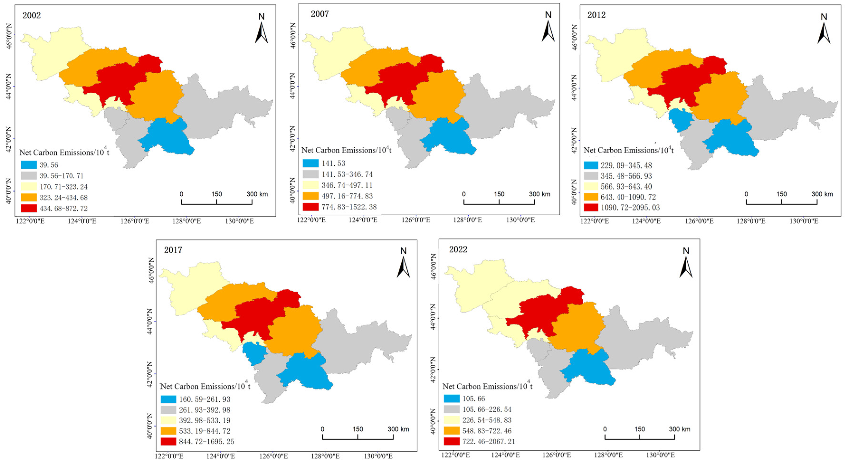 - Spatiotemporal Variations in Carbon Emissions: The carbon emissions from land use in Jilin displayed significant spatiotemporal heterogeneity. In terms of temporal trends, the province’s carbon emissions initially increased, followed by a subsequent decline. Spatially, carbon emissions were primarily concentrated in the central region, with Changchun as the core.