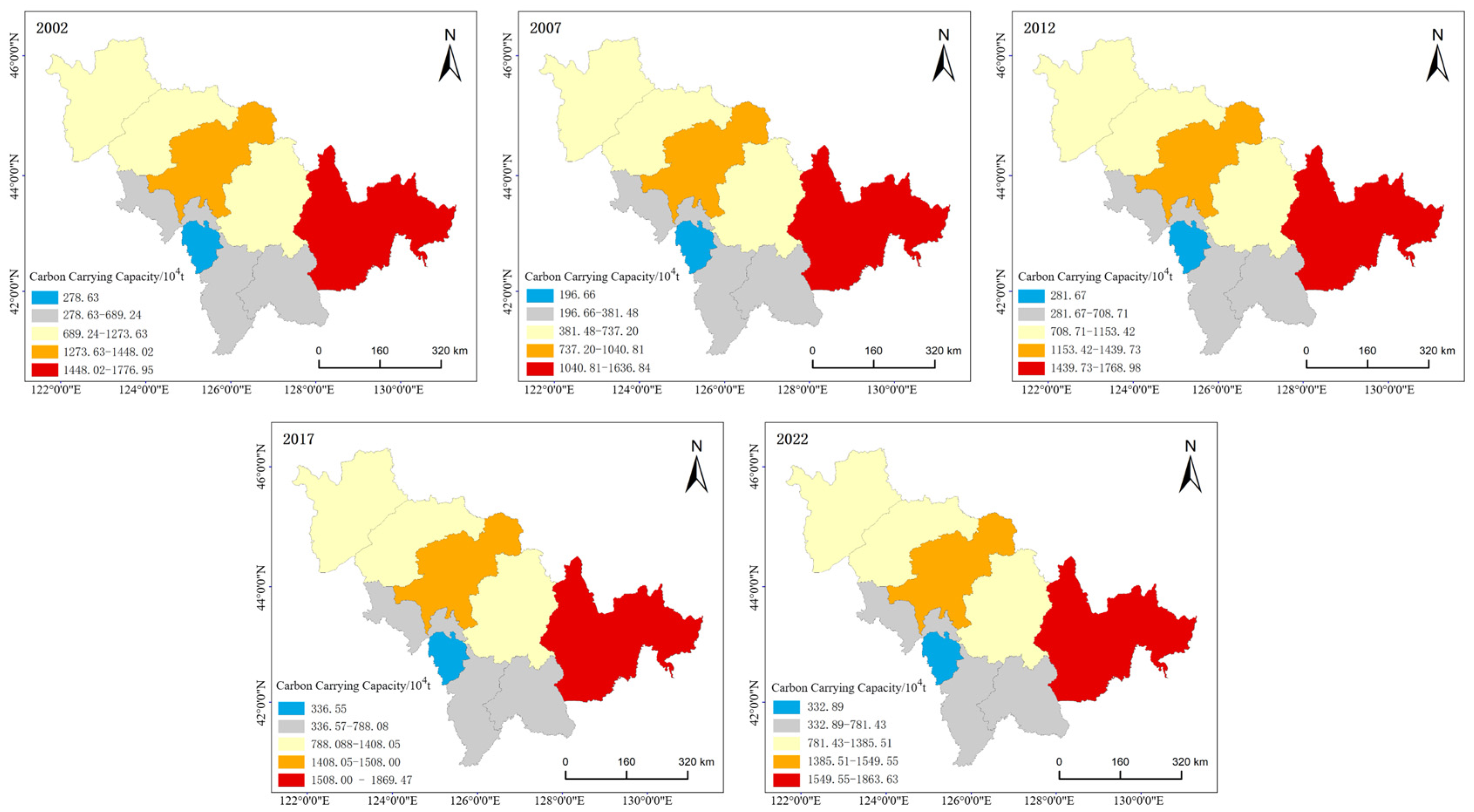 3.3. Spatio-Temporal Analysis of Carbon Ecological Carrying Capacity