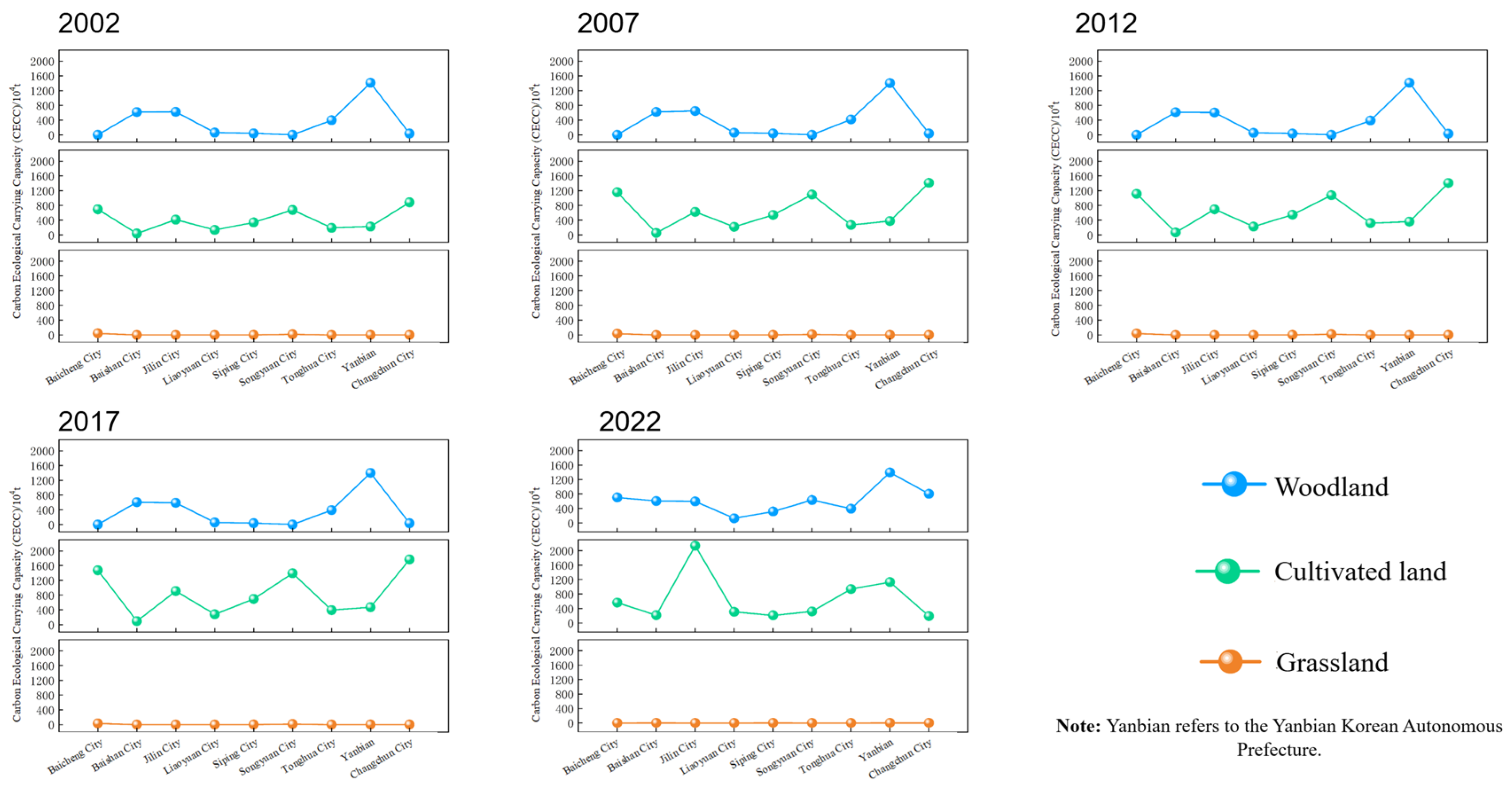 - The carbon sequestration capacity of crops in Jilin exhibited significantly higher urban variation compared to forests and grasslands. Agricultural areas, particularly cities such as Baicheng and Songyuan, demonstrated a stronger carbon sequestration capacity in crops.
