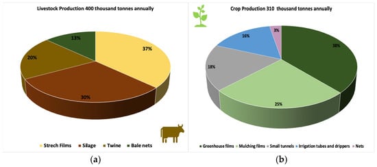Annual plastics use in Europe in (a) livestock production and (b) crop production, readapted from APE Europe.