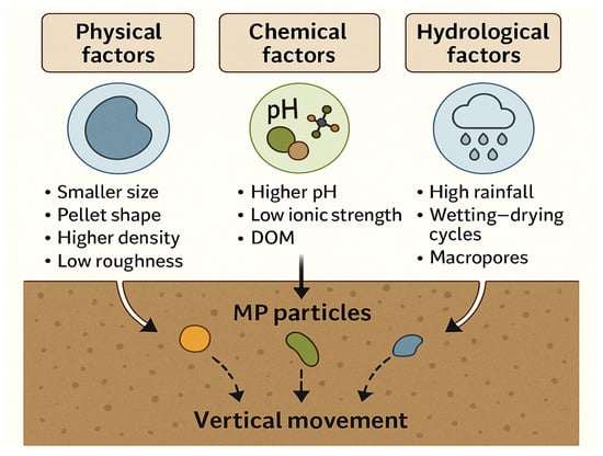 Intrinsic physical characteristics of MPs—such as particle size, shape, density, and sur-face roughness—play a pivotal role in determining their vertical mobility. Smaller particles tend to penetrate more deeply, moving more readily through soil pores [50,51]. However, migration potential does not always increase linearly with decreasing size; certain studies have identified particles in the 25–147 μm range as exhibiting the highest down-ward mobility [52]. Particle shape also exerts a significant influence. Spherical MPs, owing to their geometry and hydrophobicity, typically move downward more readily, whereas fibrous MPs are more prone to entrapment within soil pore networks [52,53]. Nonetheless, fibers can also migrate downward under specific conditions, particularly when they attach to plant roots or follow preferential flow pathways [46,54]. Density affects settling velocity but is not always predictive of final penetration depth, as hydrophobicity and other surface properties can exert greater control [51]. Higher surface roughness generally enhances adhesion to soil particles, thereby reducing mobility [55], while bio-film formation on MP surfaces can further modify transport dynamics [56].