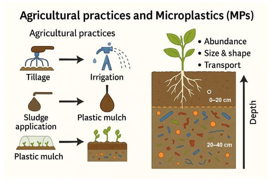 Agricultural practices exert a substantial influence on the spatial distribution of microplastics (MPs) within soil profiles. Activities such as plowing, irrigation, and the application of organic amendments not only enhance MP accumulation in surface horizons but also facilitate their vertical redistribution (Figure 4). For example, a study conducted in the Shouguang region of China reported nearly equivalent MP concentrations in the 0–20 cm and 20–40 cm soil layers, a pattern largely attributed to tillage-induced mixing [63].
