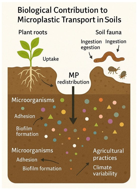 Biological systems and functions—including plant roots, soil fauna, and microorganisms—can significantly influence the redistribution and fate of microplastics (MPs) in soils (Figure 5). Plant roots physically disturb the soil matrix and can either transport MPs deeper into the profile or immobilize them within the rhizosphere [64]. Evidence from several studies has revealed the presence of small MPs within plant tissues, suggesting possible uptake and translocation to aboveground organs [65]. Arbuscular mycorrhizal fungi (AMF) may further mediate MP movement—either facilitating the transport of smaller particles across soil pores or, conversely, acting as a barrier to larger MPs [61].