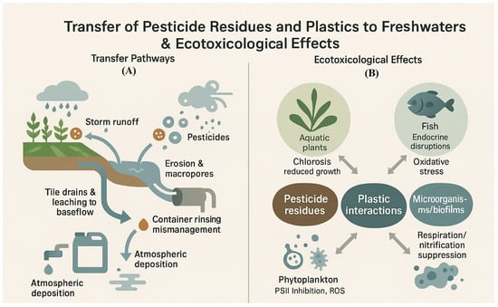 Transfer of (A) pesticide residues and plastics to Freshwaters and (B) ecotoxicological effects.