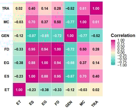 Table 3 shows relatively tight ranges for EG (8.825–9.149), ES (3.840–4.491), and especially ET (4.420–4.609), with ET also exhibiting the smallest dispersion (Stdev = 0.042) and FD the largest (0.352). Means and medians are close, but slight mean < median patterns for EG, ES, ET, FD, and MC confirm the negative skewness reported (−0.668, −0.368, −0.932, −0.544, −0.167), while GEN (0.520) and TRA (0.879) are right-skewed. Kurtosis indicates mostly platykurtic shapes (EG, ES, FD, MC < 3), whereas ET (3.864) and TRA (3.439) are mildly leptokurtic and GEN (3.176) is near-normal. Jarque–Bera statistics reject normality at 1% for EG, ES, ET, FD, and TRA; at 5% for MC; and at 10% for GEN, implying non-Gaussian distributions across the board. Practically, these features—low variance for ET, higher variability for FD, and asymmetric and (often) fat-tailed distributions—support using robust/quantile methods and heteroskedasticity-aware inference rather than relying on strict normality assumptions. Figure 1 shows the correlation between ET and its regressors. ET is weakly and uniformly negatively correlated with ES (−0.23), EG (−0.38), and FD (−0.33), and only marginally related to GEN (−0.12), MC (−0.03), and TRA (0.02).