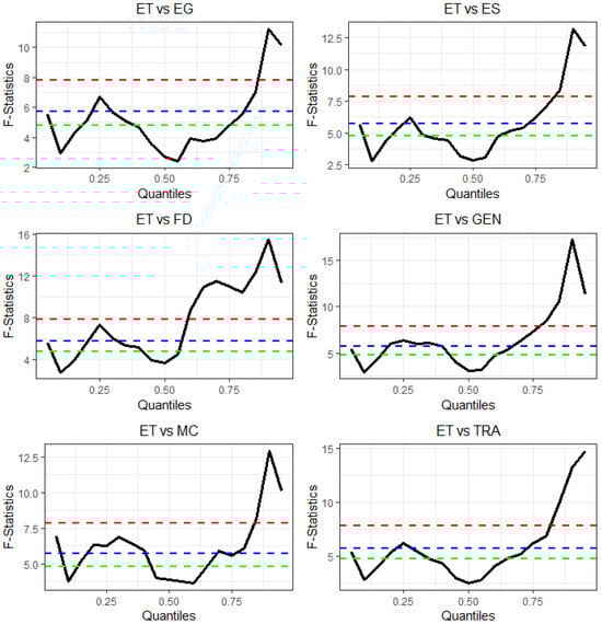 Next, we used the quantile cointegration. Figure 3 shows quantile cointegration between ET and each driver that strengthens in the upper tail and is weak or absent near the center. Using the bounds, at the 10% level, the I(0) critical value is 4.04 and the I(1) critical value is 4.78, at the 5% level, the values are 4.94 and 5.73, and at the 1% level, they are 6.84 and 7.84. For τ around 0.70 to 0.95, the F-statistics for all pairs with ET rise well above even the 1% I(1) bound, with peaks near 16 for ET–FD, about 17 for ET–GEN, roughly 13 for ET–ES and ET–MC, near 14 for ET–TRA, and around 11 for ET–EG, which signals strong long-run linkage when ET is high. For τ below roughly 0.25, the evidence is mixed, with several pairs intermittently clearing the 5% or 10% bounds, which suggests episodic cointegration when ET is unusually low. For τ in the middle range, roughly 0.35 to 0.60, most F-statistics remain below even the 10% I(0) bound, which implies no cointegration around the median. Overall the pattern indicates state-dependent adjustment in which the equilibrium relationship binds most tightly when the energy transition index is in a high regime and only occasionally when it is depressed, while normal conditions display loose or no long-run coupling.