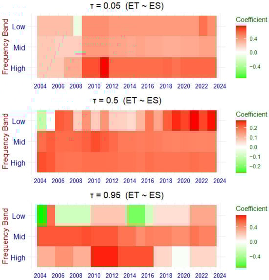 Furthermore, at τ = 0.50 and τ = 0.95, the story strengthens further. The median panel is red across all bands and deepens after 2015, showing that in “normal” conditions, ES systematically lifts both short-run and persistent components of ET. The upper tail panel shows intense red in mid- and high-frequency bands around 2010–2016, consistent with Brazil’s surge in wind/solar auctions and biofuel mandates, where specialized technicians, engineers, and project managers were pivotal for rapid deployment [41]. Occasional green patches at the low-frequency edge early on likely reflect the multi-year lag between education policy and structural ET outcomes; these fade as a trained workforce scales. External evidence matches this pattern—Brazil’s renewables expansion has been accompanied by strong job creation and an evolving skills base, while some studies such as [42] document that human capital and TVET underpin clean-energy diffusion, reduce energy intensity, and improve environmental performance across emerging economies, including BRICS. Together, the heatmaps imply that education and skills function as an “enabler” of ET in Brazil, with the largest effects appearing when the transition is already advanced and moving quickly [39].
