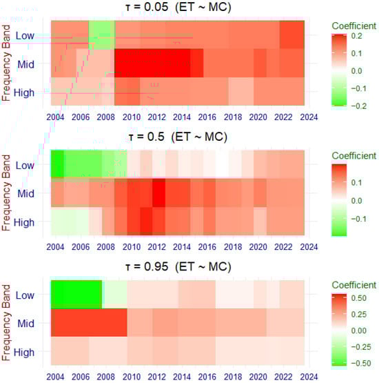 Moving to τ = 0.50 and τ = 0.95, the positive MC impact on ET association remains, but its texture varies by frequency. Around the median, red tones dominate all bands and peak in the mid-frequency window circa 2011–2014, reflecting managerial routines that convert policy signals and learning-by-doing into scalable deployment—standardization of EPC processes, improved procurement, and tighter project controls—thereby accelerating ET’s cyclical and medium-horizon components. In the upper tail, the early 2010s show strong mid-frequency gains that taper as the market matures, consistent with evidence that auctions deliver larger renewable additions where the business environment and organizational capabilities are stronger [44]. This implies that managerial capacity as an execution enabler in Brazil’s transition—most powerful when the buildout is rapid and coordination-intensive—matches broader findings that managerial and dynamic capabilities foster green innovation and help firms absorb and reconfigure resources for cleaner production [38].