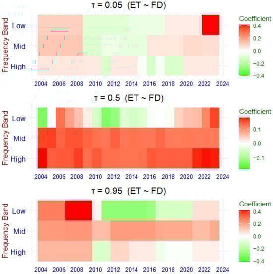 Figure 8 analyzes how FD shapes Brazil’s ET. At (lower tail), the low-frequency effect of FD is mostly positive and becomes strongly positive only in recent years, while the mid- and high-frequency effects turn negative at times around 2010–2016 before reverting to slightly positive. Under stressed ET conditions, short- and medium-run credit cycles at times hampered progress—consistent with post-2008 and 2014–2016 tightening, project delays, and balance-sheet constraints—while the slow, structural channel grew increasingly supportive as green instruments scaled. The later low-frequency strengthening aligns with BNDES’s expanded green facilities and the rise in long-tenor finance and corporate PPAs that de-risk utility-scale renewables and transmission [38,46]. Around the median (τ = 0.50), FD consistently supports ET—positive at mid/high frequencies with only brief early weakness at low frequencies. This aligns with Brazil’s auction-led model, where project finance and development banks lower capital costs and reduce execution risk. At τ = 0.95, mid-frequency effects remain positive but smaller, while low-frequency turns negative for several years in the 2010s before normalizing—signaling diminishing returns when ET is high and grid, permitting, or supply chain bottlenecks bind. Cross-country evidence [9] shows state-dependent FD, and Brazil’s new climate funds plus offshore-wind and reforestation finance suggest de-risking continues to crowd in private investment.