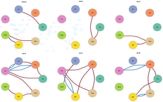 Next, we employed the Quantile Granger causality (QGC). The QGC (see Figure 10) lets predictability vary with the state of the system, so each panel answers who helps forecast whom when variables sit in the lower tail Q0.05, the middle range Q0.25 to Q0.50, or the upper tail Q0.75 to Q0.95 of their distributions. In the lower tail, the network is sparse and dominated by a few links. In the original panel, movements in ET help forecast EG while MC and TRA each help forecast GEN, which suggests that institutional capacity tends to adjust after operational or market shifts. At Q0.05, TRA is the main transmitter, with EG helping forecast TRA and TRA then helping forecast ES. When the system is stressed, openness shocks appear to pass through real activity before showing up in the skills channel, and most other nodes add little extra predictive content.