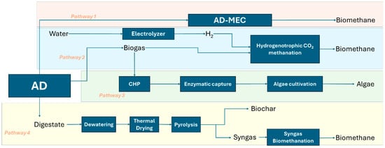 In this context, this paper addresses four different technological approaches that render AD with zero or negative carbon dioxide emissions, as illustrated in Figure 1. Pathway 1 involves the integration of microbial electrolysis cell into AD system, for in situ conversion of CO2 and H2 in methane.