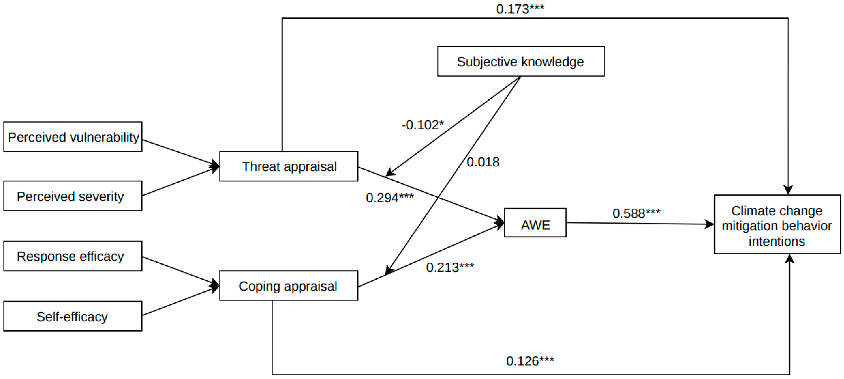 | Subjective knowledge on climate change (SK) | 0.200 | 0.288 | 0.783 | 0.067 [0.065, 0.152] | 0.210 [0.113, 0.331] | 0.085 [0.066, 0.200] | 0.412 [0.302, 0.522] |