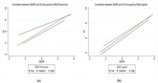 Relationship between GEPE and regional green innovation under different levels of R&D element flows (fitted scatter plots). Panel (a) groups sample regions by R&D personnel flow, while Panel (b) groups by R&D capital flow. Note: Scatter points are omitted for clarity; fitted lines represent the linear relationship between GEPE and regional green innovation across subgroups of R&D element flow.