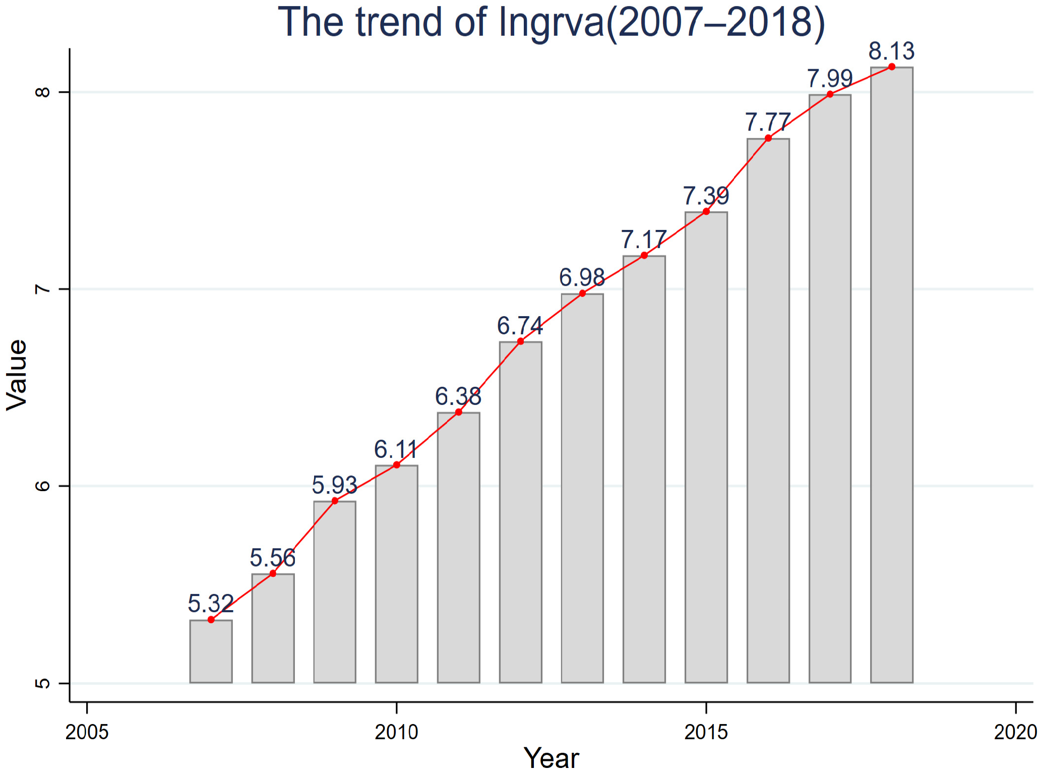 Ingrva) over the sample period, increasing from approximately 5.32 in 2007 to 8.13 in 2018. This provides a descriptive foundation for the empirical analysis and implies that China’s focus on environmental protection and innovation has yielded observable progress over time.