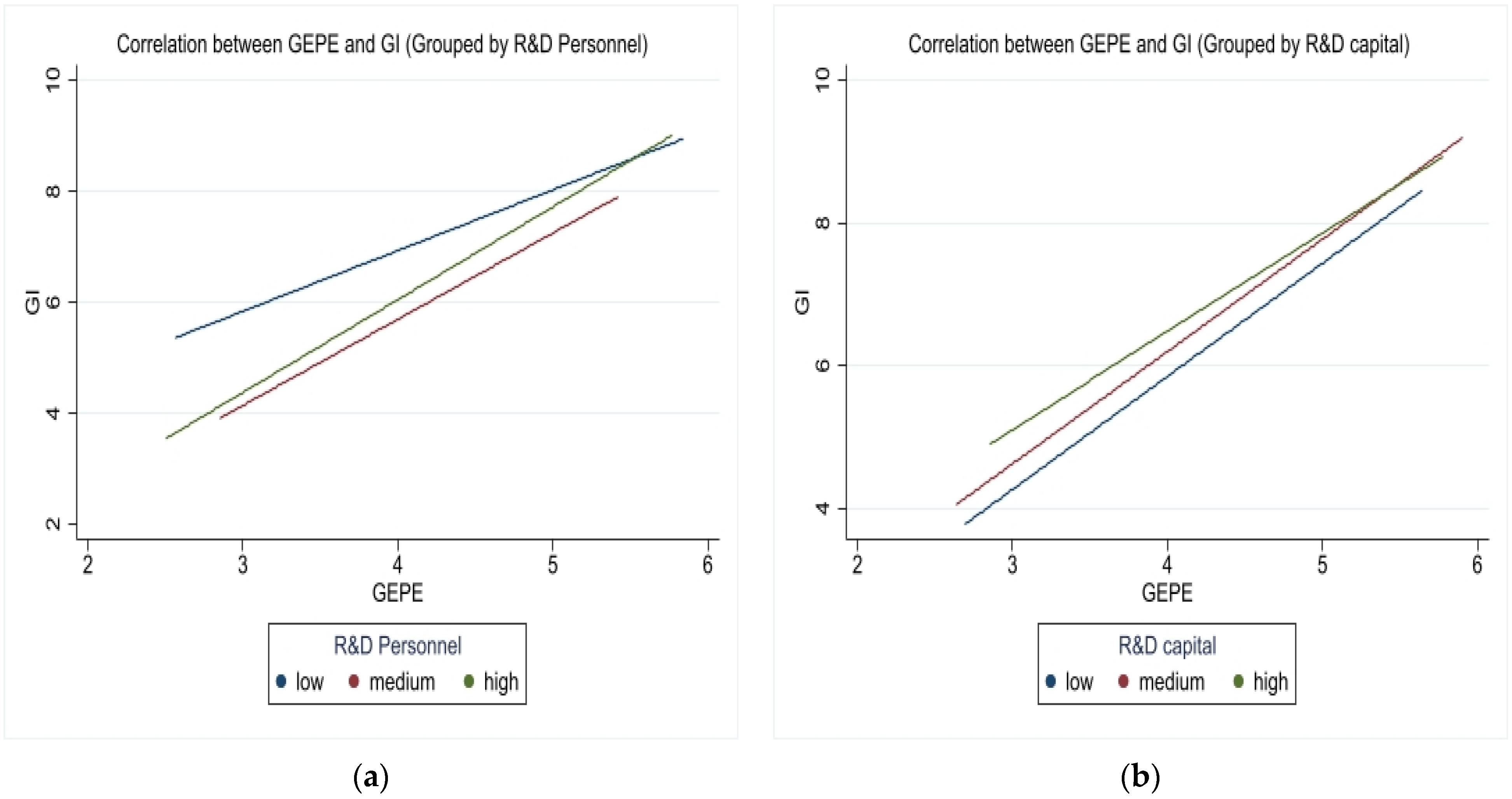 Figure 2b remain largely parallel across R&D capital–flow groups, suggesting that capital flow does not materially alter this relationship. These visual patterns reinforce the empirical findings that R&D personnel flow significantly strengthens this relationship, whereas R&D capital flow does not demonstrate a moderating role.