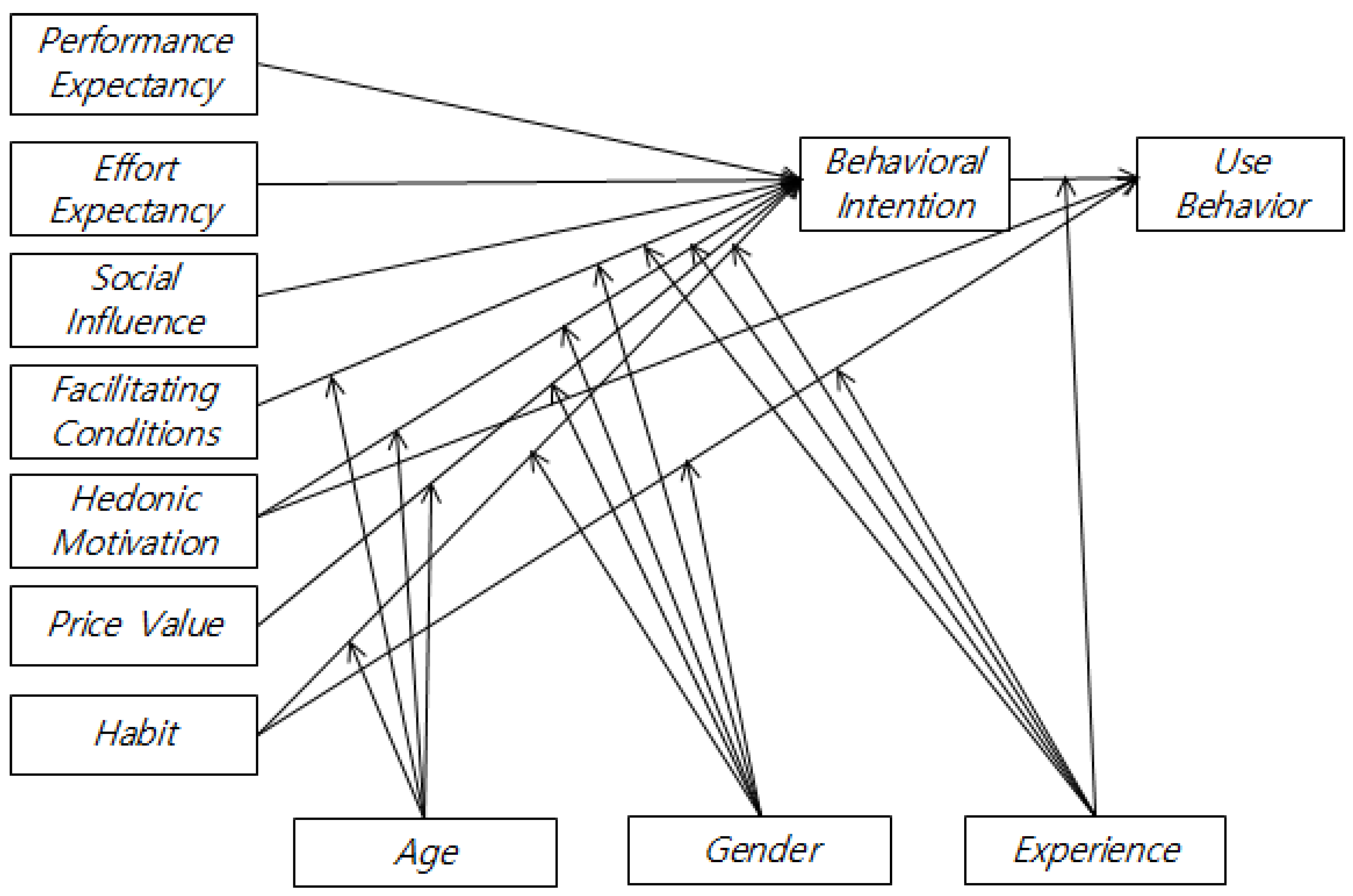 26]. The UTAUT model integrates eight previous models related to the intention to accept and use innovative technologies. It considers several variables that influence users’ behavioral intention, including performance expectancy, effort expectancy, social influence, and facilitating conditions. In addition, the four variables of gender, age, experience, and voluntariness are proposed to play a moderating role in behavioral intention.