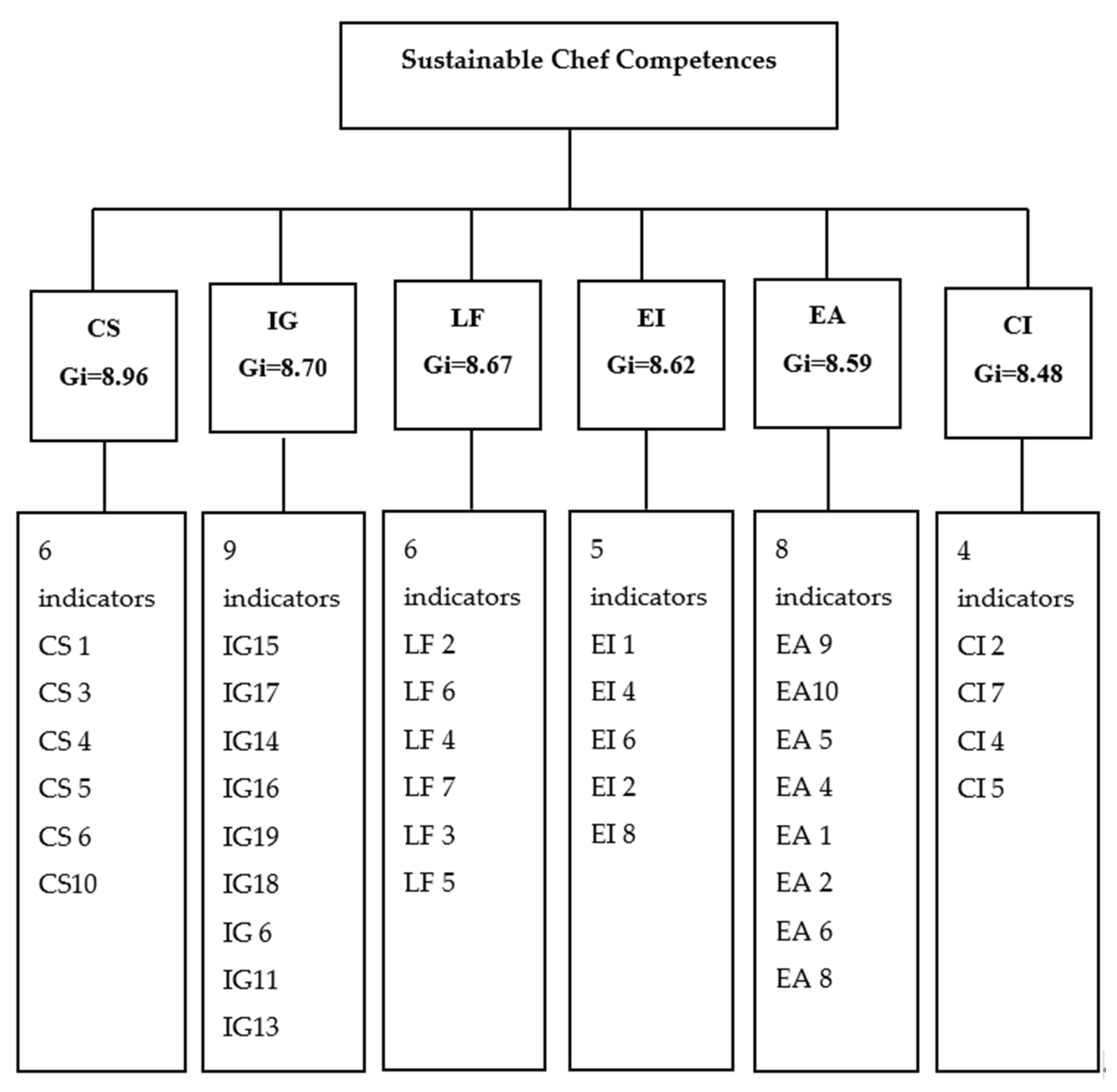 - Culinary Skills (Gi = 8.96): Highest-ranked, affirming that technical proficiency remains foundational to sustainable culinary practice.