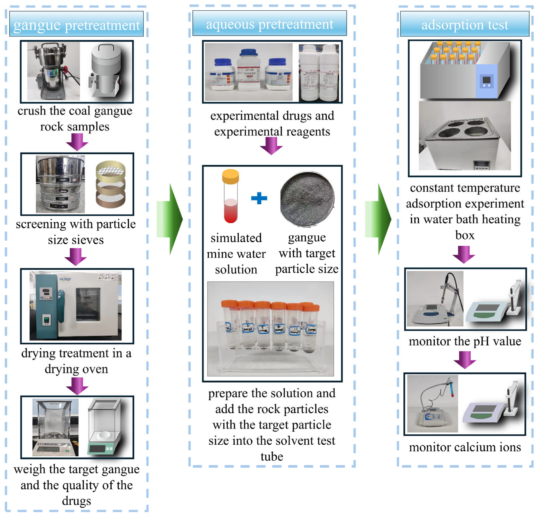 - Mine water solutions with different Ca2+ concentrations and pH values were prepared. Pre-weighed quantities of rock particles were measured using an electronic balance (Model JJ224BC, Shuangjie Testing Instrument Factory, Chuangshu, China) and placed in centrifuge tubes. The tubes were then positioned in a constant-temperature water bath (Model BSH, JoanLab Equipment (Zhejiang) Co., Ltd., Huzhou, China) to conduct batch adsorption experiments under various conditions.