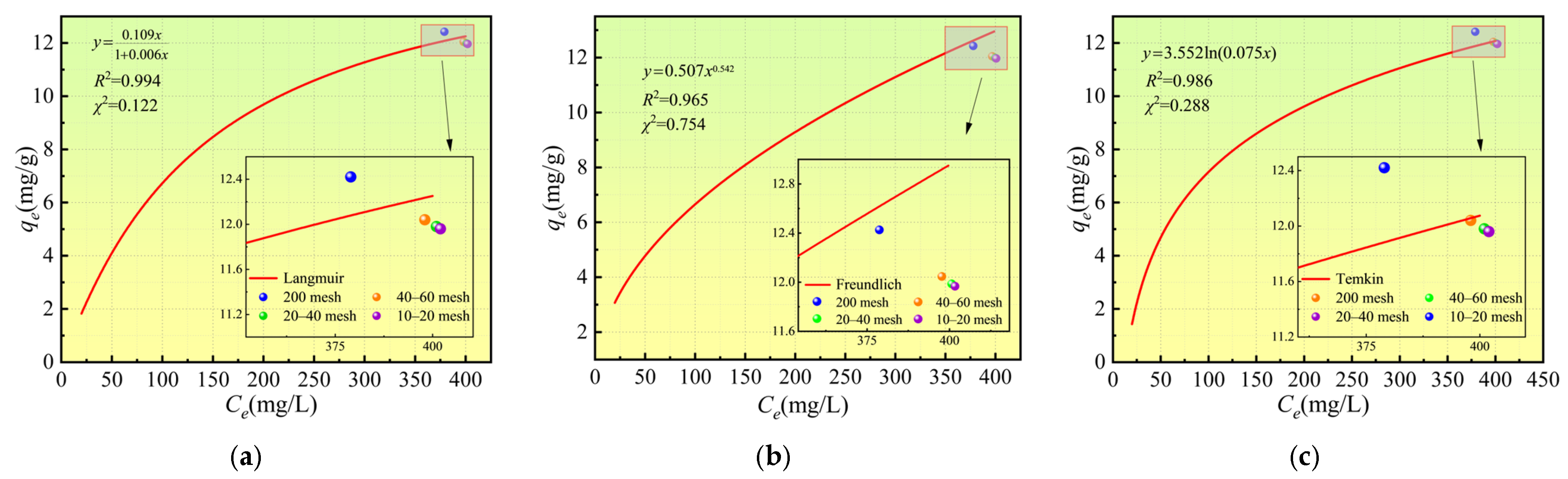| Temkin | bT (kJ/mol) | AT (L/g) | R2 | χ2 |