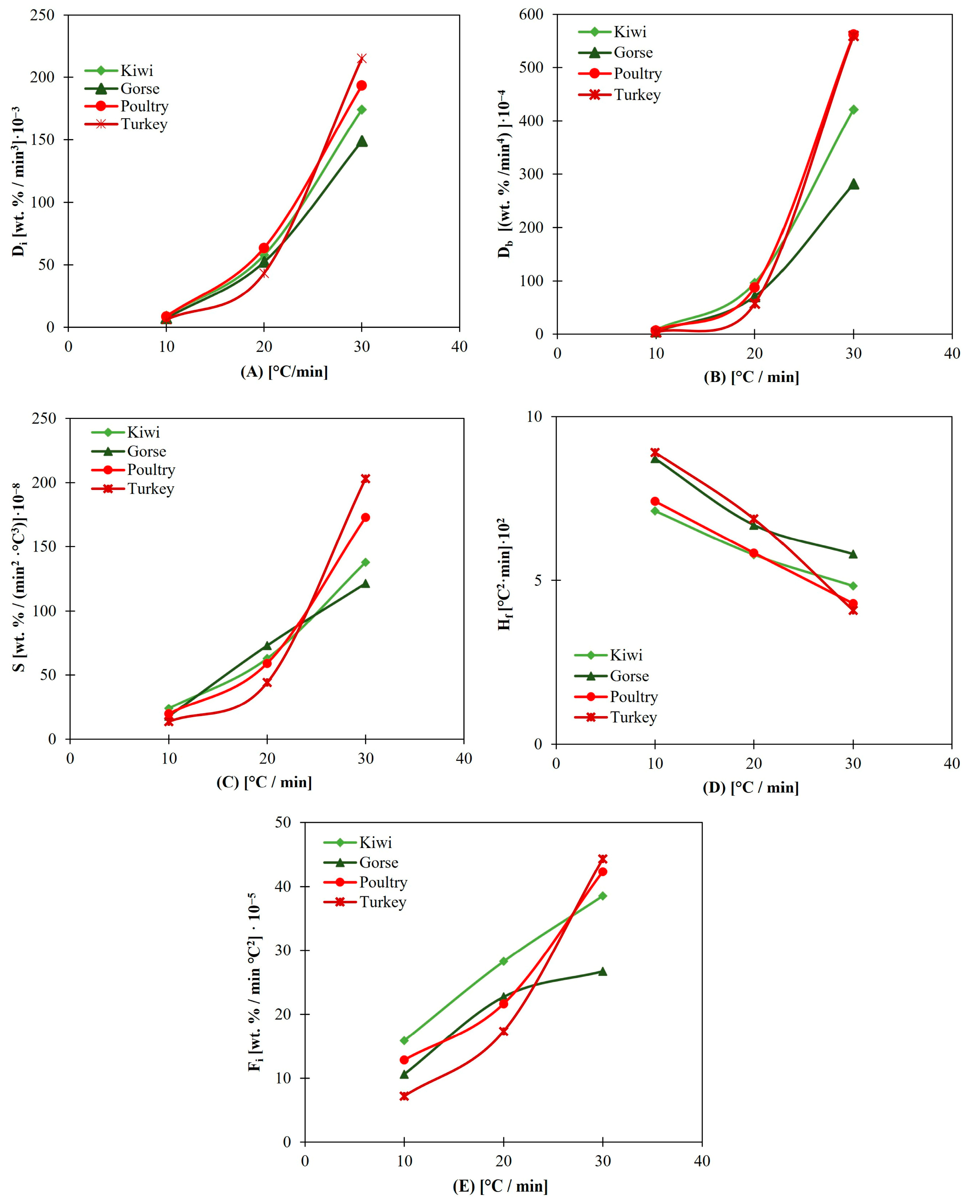 3.6. Combustion Parameters for Animal Biomasses Compared with Those for Nonanimal Samples