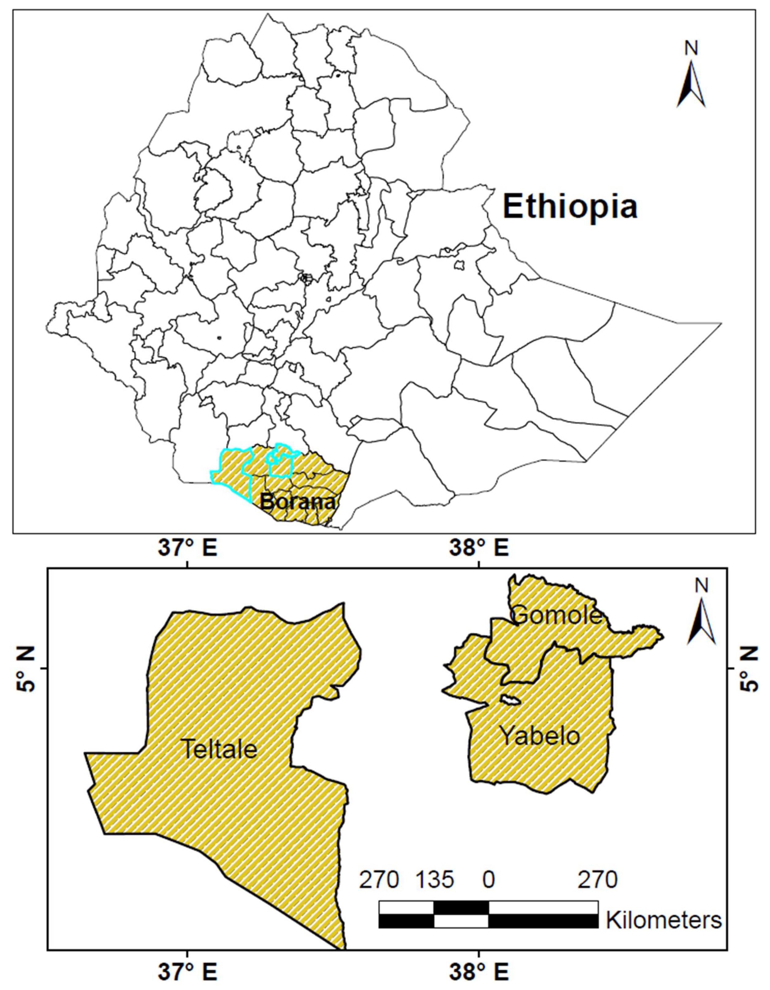 The study was conducted in three woredas (districts) within the Borana zone of southern Ethiopia, namely, Teltale, Yabello, and Gomole (Figure 1). These areas are situated in the lowland agro-pastoral areas, characterized by a mix of crop–livestock production systems [24]. Yabello Woreda spans approximately 9327 km2, with altitudes ranging between 1200 and 1800 m above sea level (m.a.s.l). Teltele Woreda covers an area of about 10,620 km2, with its elevations ranging from 500 to 1500 m.a.s.l. Moreover, Gomole Woreda covers an area of 8500 km2, featuring elevations that lie between 1000 and 1500 m.a.s.l. These selected areas showcase a diverse topography that reflects the unique geographical characteristics of the Borana zone. Moreover, these areas are largely classified as semi-arid and lowland, which significantly influences their agricultural and pastoral activities [21]. Temperature ranges from 20 °C to 30 °C throughout the year but can reach over 35 °C during the dry seasons [25]. The economy of Yabello is primarily based on the rearing of livestock, such as cattle, goats, sheep, and camels. Crop productions are also commonly practiced, producing crops like maize, sorghum, and beans [26]. The annual average rainfall of the study areas varies between 400 and 700 mm [27,28], with the rainy season concentrated between March and May and from September to November. Rainfall is bimodal, with the main rainy seasons occurring between March and May (long rains) and from September to November (short rain), though variability often leads to prolonged drought periods [28,29]. Livestock production is the primary source of livelihood in the study areas, but crop production is practiced, producing crops such as maize, sorghum, and teff, though rainfed [27,28].