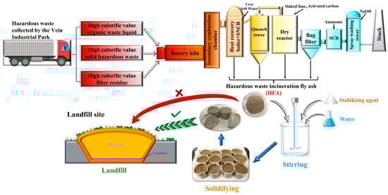 The Hazardous waste incineration fly ash samples (HFA) were obtained from a hazardous waste disposal company in Nanjing, Jiangsu, China. These samples originated from a novel hazardous waste co-disposal process that combines various sources of complex hazardous wastes collected by a multi-source hazardous waste co-disposal system. This system incorporates physical, incineration, and landfill methods to manage these hazardous materials. The HFA is a byproduct of incinerating industrial hazardous solid wastes and waste liquids with intricate compositions. The flow of HFA generated by the co-disposal process and its solidifying and stabilization treatment are shown in Figure 1.