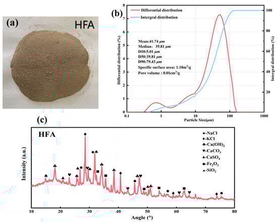 The visual examination of HFA, as depicted in Figure 2a, reveals a light brown coloration with fine sand-like particles. The particle size distribution of HFA, as demonstrated in Figure 2b, follows an approximate normal distribution, featuring an average particle size of 41.74 µm and a median particle size of 39.81 µm. The particle size distribution is notably concentrated within the range of 10–100 µm, surpassing the dimensions of conventional incineration fly ash [,,]. Additionally, this larger particle size results in a relatively diminished specific surface area of HFA (1.18 m2/g) and a reduced pore volume (0.01 cm3/g).
