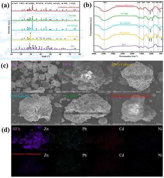 Figure 5c illustrates the SEM images and elemental distribution of untreated HFA, HFA solidified with 150% cement, HFA solidified with 20% NaH2PO4, HFA solidified with 15% SDD, and the combined stabilization treated HFA. Untreated HFA was observed to be loosely agglomerated into spherical particles with a wide range of particle sizes and morphologies. These agglomerates displayed uneven surfaces with loosely dispersed structures and large voids, leading to higher porosity, which facilitated the accumulation of heavy metals on the surface, consequently contributing to environmental pollution [,]. In contrast, the surfaces of the treated samples exhibited denser characteristics with fewer voids, signifying a notable reduction in the porosity of the fly ash particles subjected to compound stabilization. The structure became more compact and dense, thereby decreasing the risk of heavy metal leaching []. Additionally, flakes and fine particles adhered to the surface, suggesting that the stabilizing agent reacted with displaced heavy metals, leading to precipitation or chelation and subsequent adsorption onto the surface and within the voids. The surface may also bind with Al, Fe, and other substances, resulting in surface densification of the fly ash particles []. The EDS elemental energy spectra in Figure 5d revealed a significant reduction in the presence of the four elements—Zn, Pb, Cd, and Ni—which leached out of HFA on the surface of the sample following treatment with the combined stabilizing agent. This observation aligns with the heavy metal data, indicating the successful precipitation or chelation of most of the excess heavy metals, resulting in effective solidification.