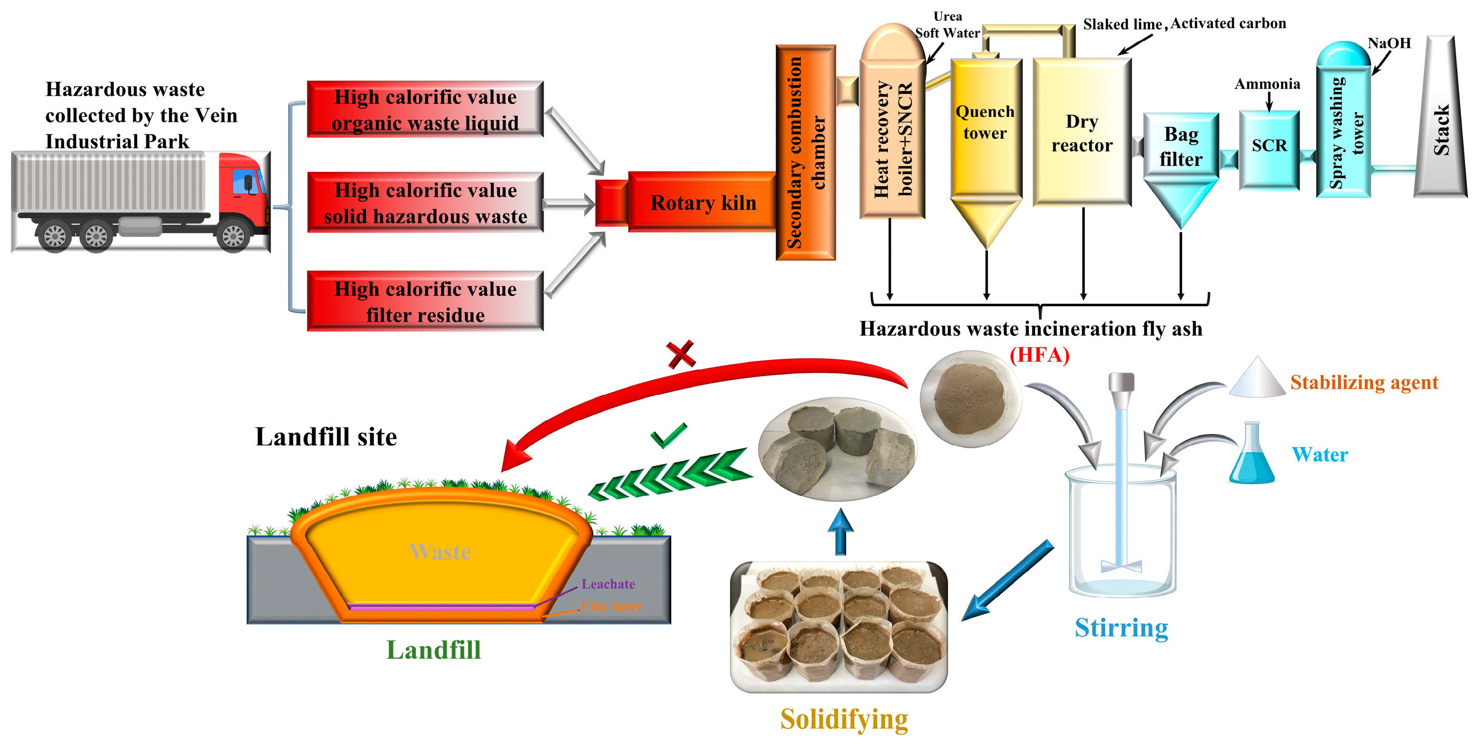 - The hazardous waste incineration fly ash produced through the new co-disposal process exhibits differences in appearance, chemical composition, and dioxin content compared to traditional fly ash, primarily due to distinct generation conditions. Notably, the heavy metal leachate from HFA surpasses the pollution control standards established for municipal landfills in China concerning the content of zinc, lead, cadmium, and nickel. Therefore, effective stabilization is imperative before landfill disposal.