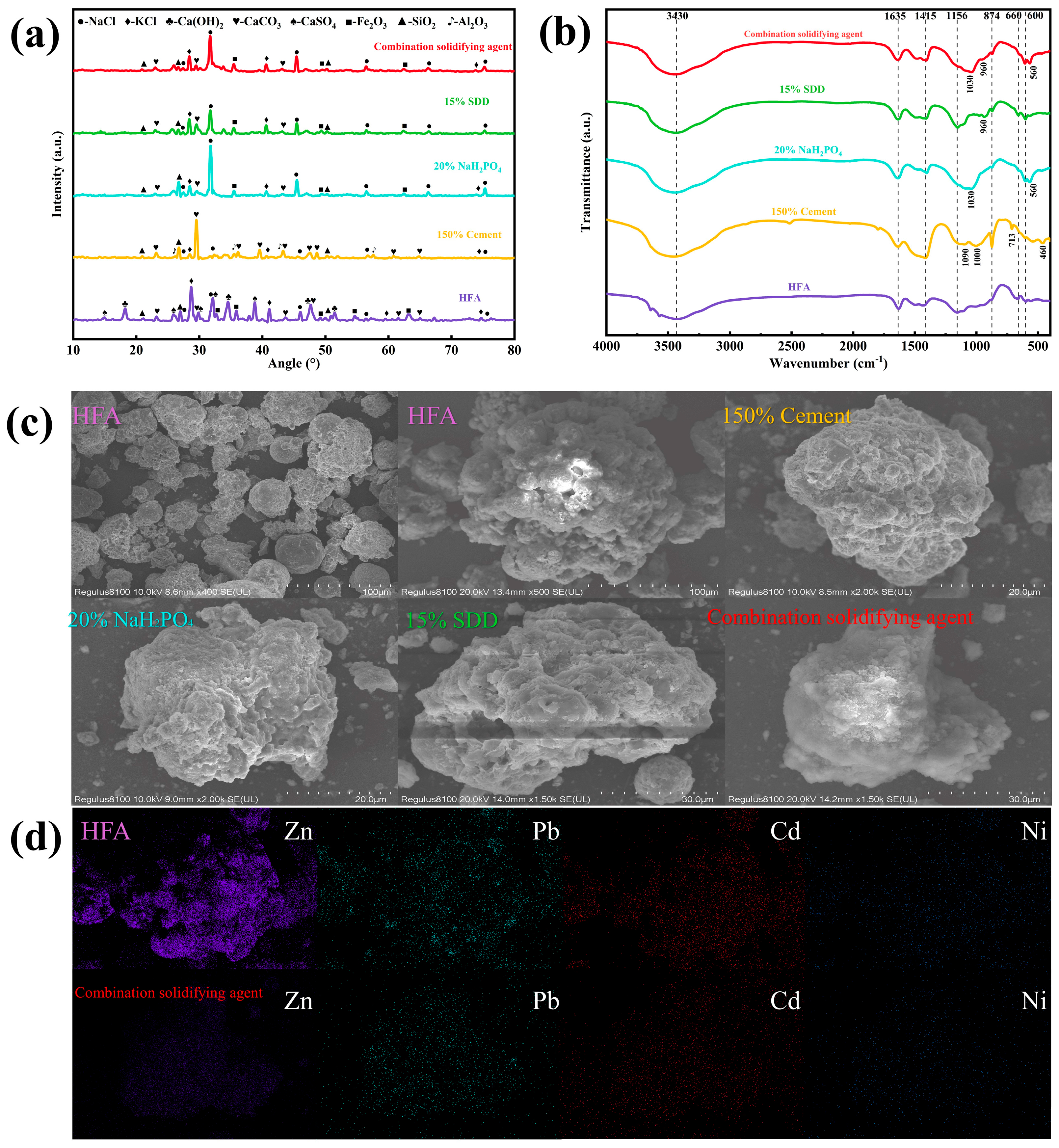 - The combined stabilizing agent demonstrates a strong binding capacity and stability when interacting with the target heavy metals. Analysis of XRD, FTIR, and SEM data reveals that the combined stabilizing agent can effectuate the transformation of heavy metals from unstable to stable states through precipitation, adsorption, and chelation reactions with HFA. Additionally, it partially adheres to the surface of HFA particles, thereby densifying the surface structure of the particles and substantially decreasing the potential for heavy metal leaching from HFA.
