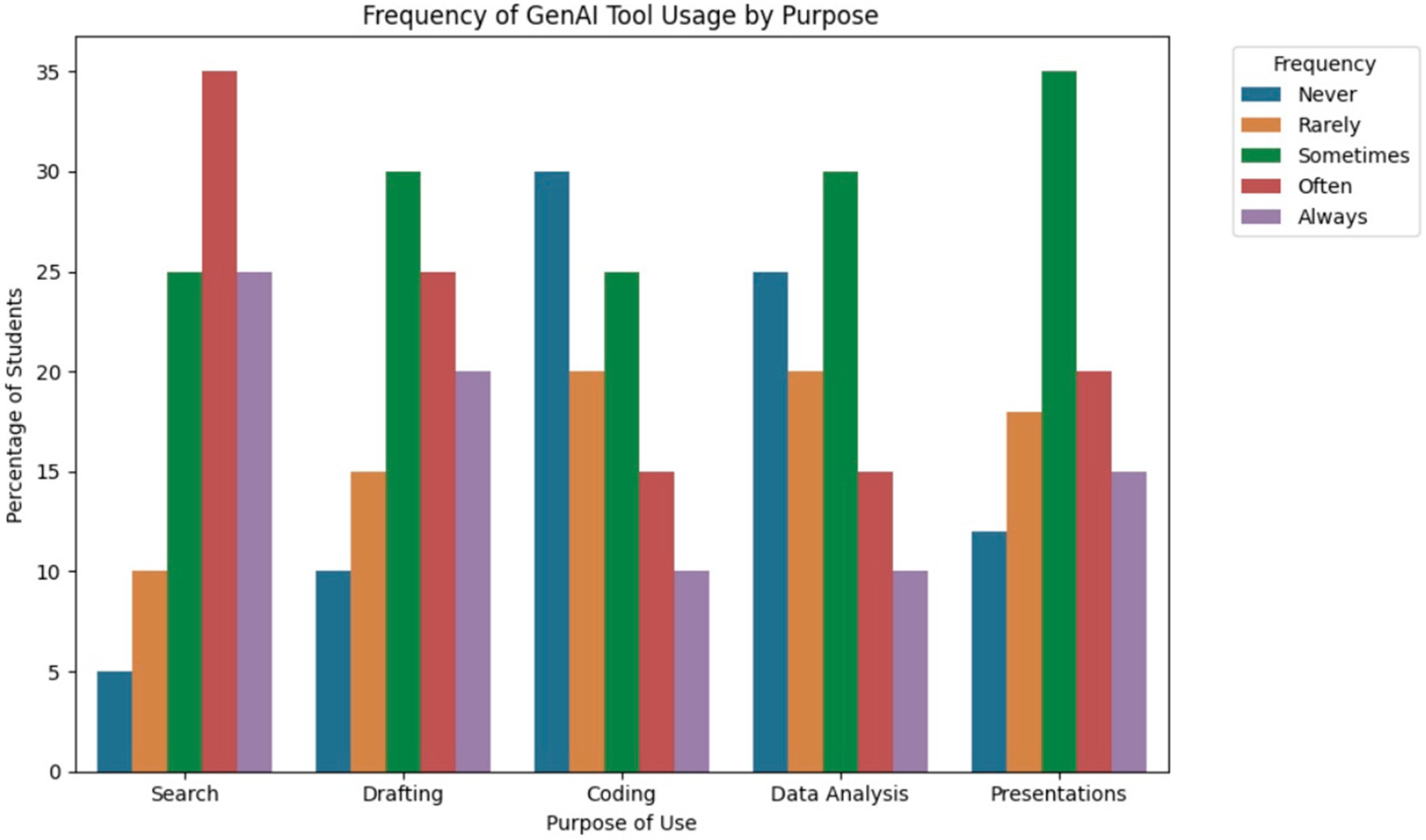 - GenAI tool usage patterns–frequency of use and purposes in academic contexts (e.g., writing, coding, information search, analysis);
