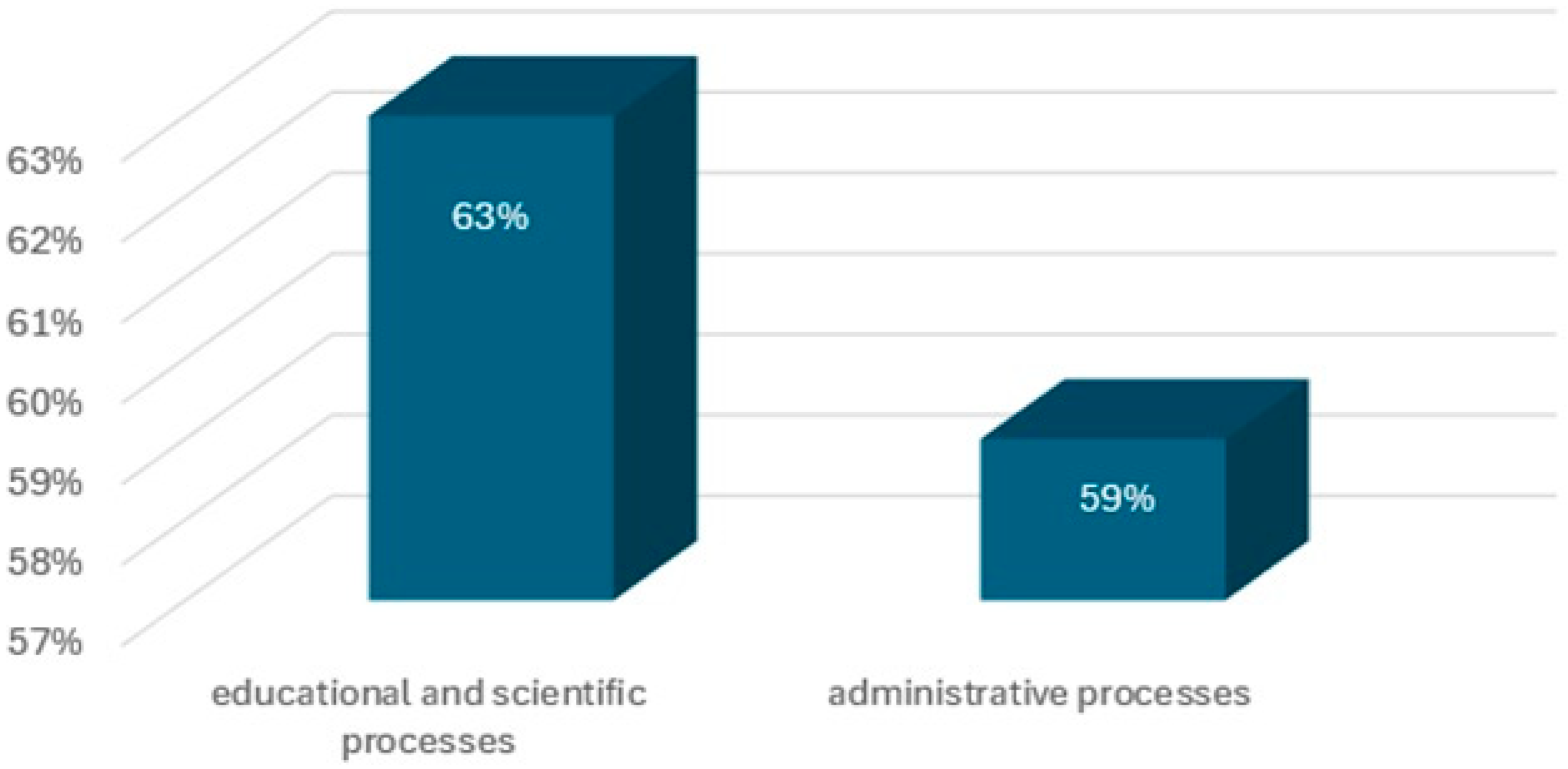 | Use of digital technologies | Active use of LMS, video, clouds, AI; 30% have difficulties | Limited use, concerns about new tools | Demand for simulators, AI, data analysis |