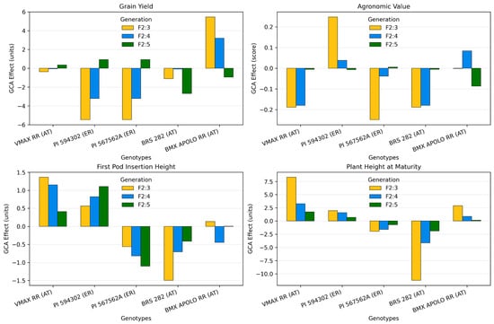 For GY, VMAX RR (AT) consistently exhibited positive GCA effects across generations, confirming its role as a donor of favorable alleles for yield (Figure 2). PI 567562A (ER) and BRS 282 (AT) also contributed positively in F2:5, while BMX APOLO RR (AT) and PI 594302 (ER) presented negative effects, with the latter showing strong unfavorable contributions in early generations.